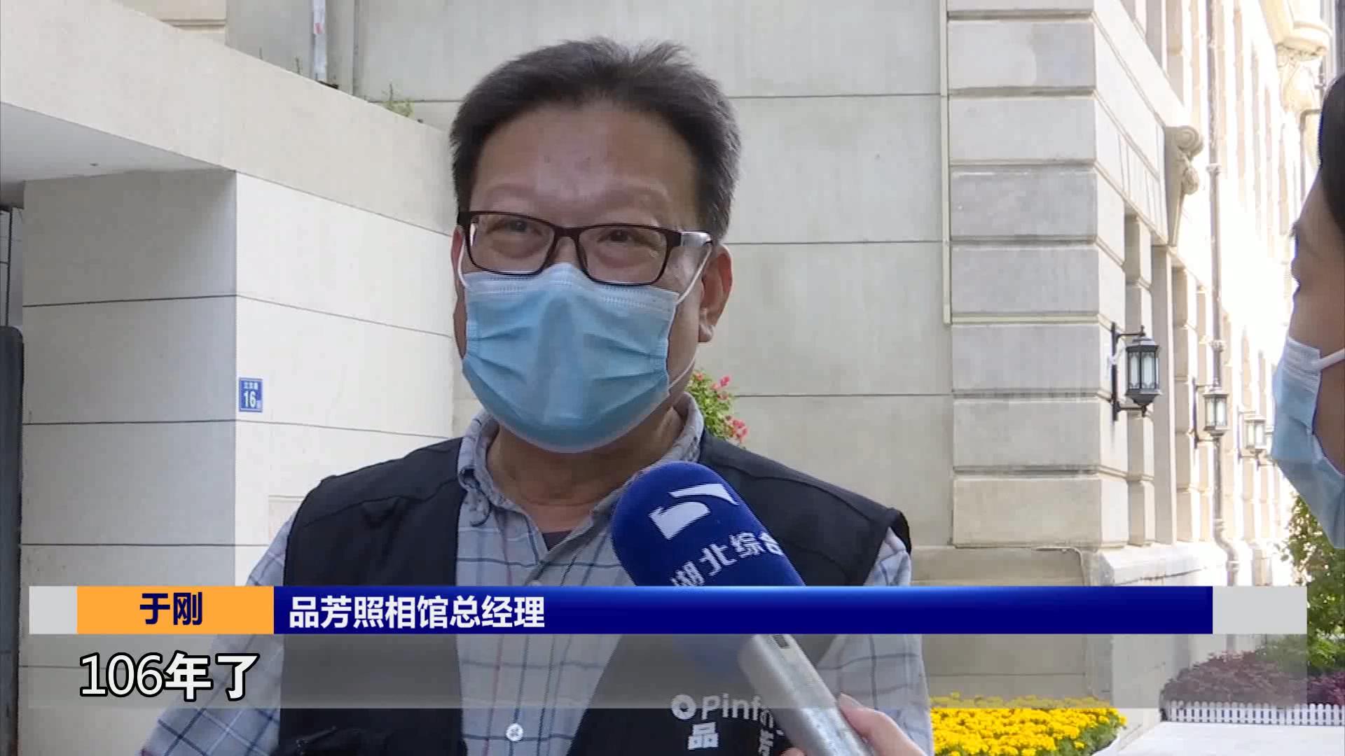 品芳照相馆总经理 于刚:106年了,1914年成立的。能够勾起武汉的一些老的回忆,很多家庭都有品芳的老照片。这个老人是西安的,以前在武汉做生意,那估计也是一九一几年二几年拍的,这是他的孙子,从西安过来一定要照一张跟他爷爷一样的照片。