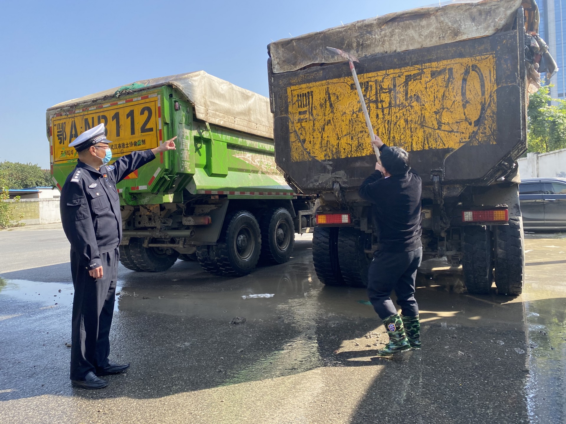 车身不洁、号牌污损、沿途漏洒等现象,不仅污染城市道路环境,而且影响行车安全。2020年11月4日上午,江汉区交通大队民警来到武汉建虹机械工程有限公司停车场,组织渣土车企业负责人、驾驶员学习相关法律法规,并对每辆渣土车车容车貌进行检查。