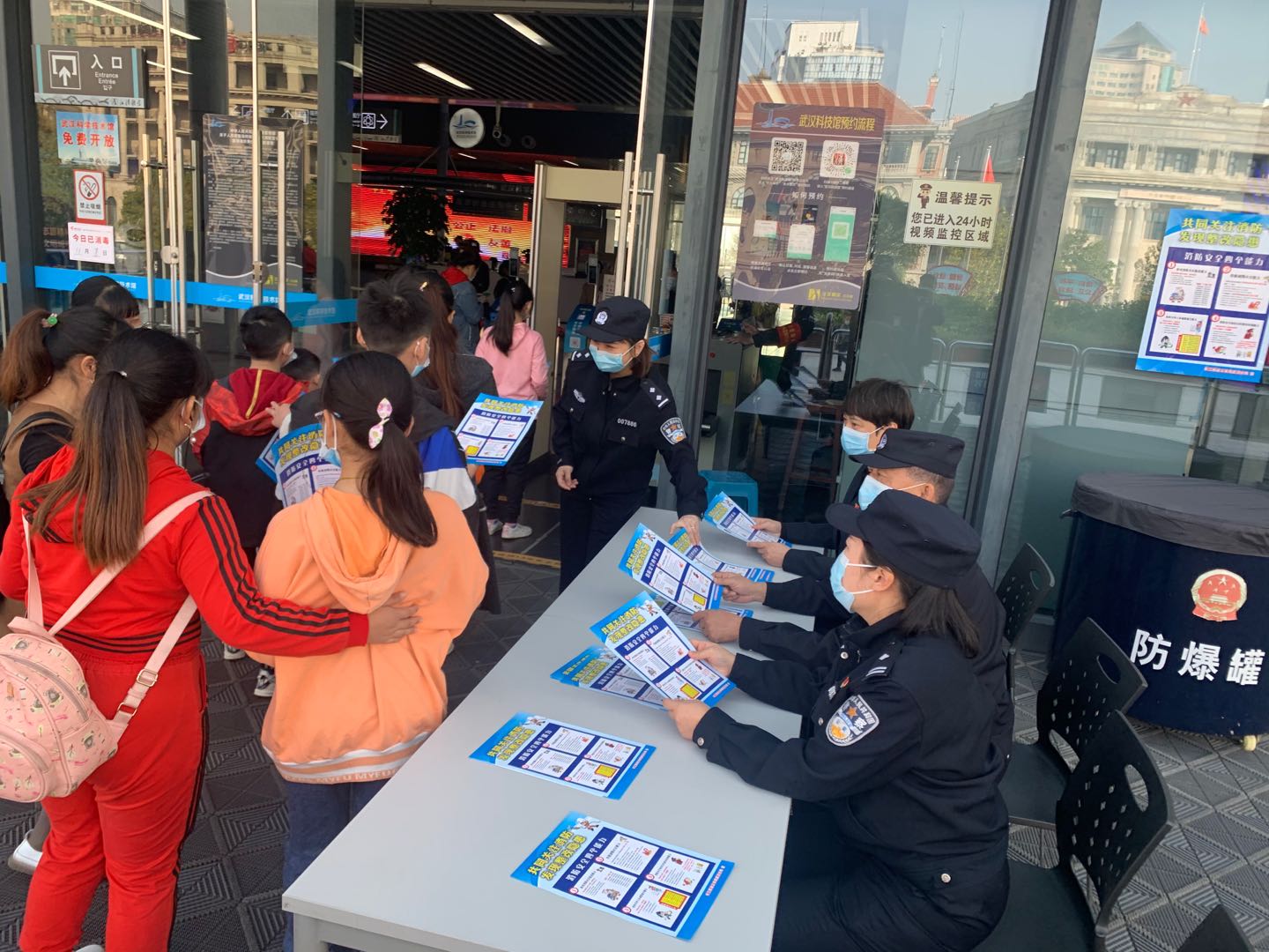 “您好!请看下我们的宣传资料,时刻关注消防安全,了解防火知识。”只见长航公安民警们将一张张消防安全宣传单递到武汉科技馆入馆群众的手中,话音刚落,入馆的大朋友、小朋友们纷纷上前询问什么是消防安全隐患、如何使用灭火器等一系列相关问题。民警们用通俗易懂、深入浅出的方式向大家讲解如何预防初期火灾、火场逃生自救等方面的知识。