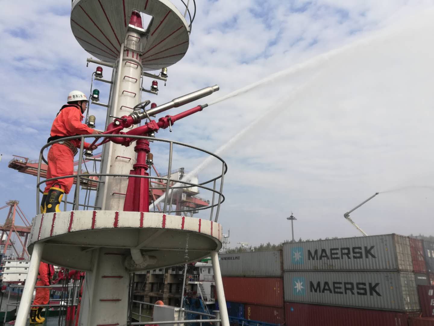 3分钟后,公司微型消防站消防员携装备器材赶到现场,鉴于火灾即将形成蔓延之势,公司现场指挥员当即决定将已形成猛烈燃烧的集装箱重新吊回码头平台进行近距离灭火处置,同时指令失事船舶船员对货舱集装箱蔓延之火进行冷却灭火以待后援。