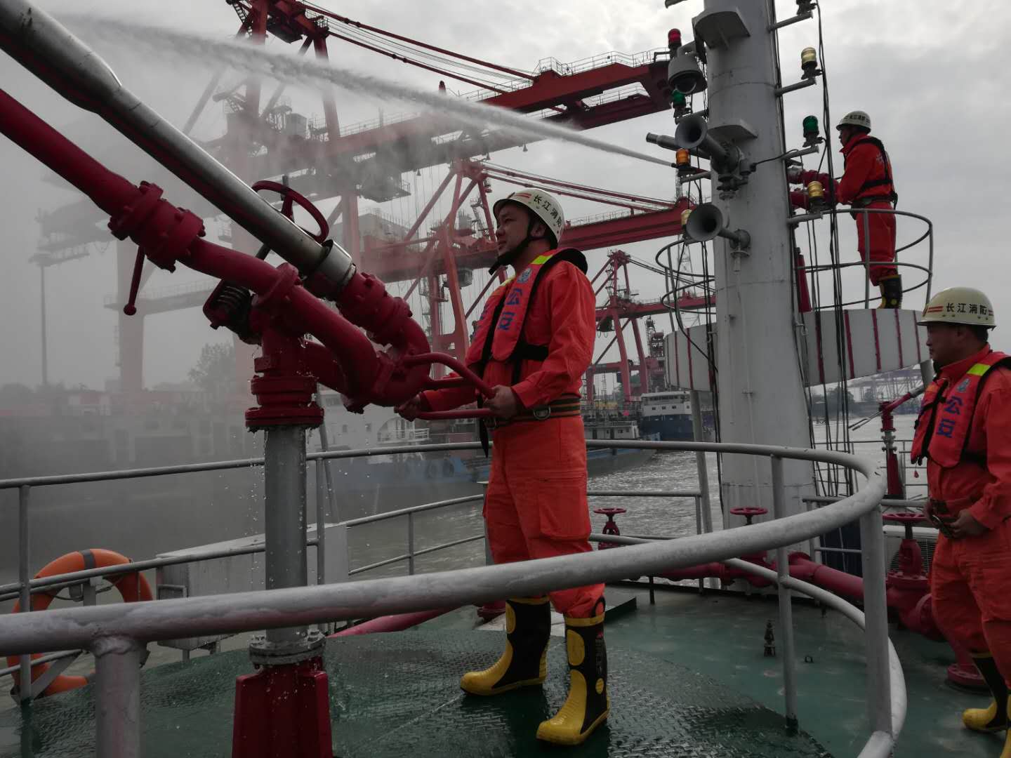 11月6日上午,长航公安局武汉分局水上消防支队、武汉市新洲区阳逻消防救援站、武汉国际集装箱有限公司在长江武汉阳逻水域,举行船舶火灾灭火救援联合演习。