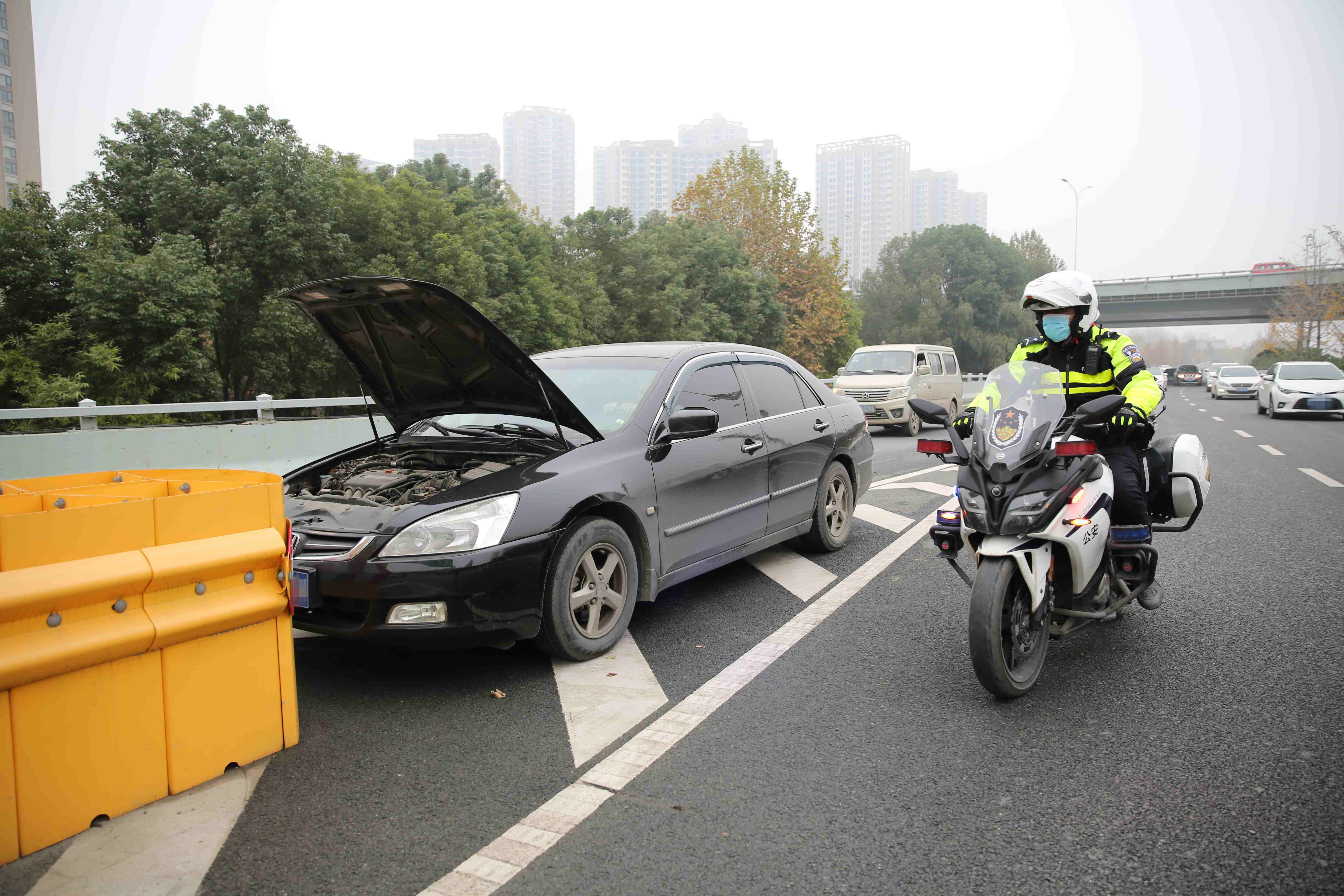 演练模拟在大雾天气下,三环线姑嫂树立交桥桥面道路湿滑,一辆黑色小轿车在准备驶入匝道时,由于未提前减速观察路面情况,迎头撞上道路防撞墩,导致车辆受损、驾驶员昏迷不醒的交通事故。