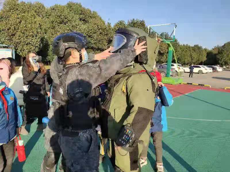 武器装备展示区也是挤满了人,“好重啊,穿这么重的衣服工作,真是辛苦。”一名大叔兴冲冲地穿上排爆服,立马就被压得呲牙咧嘴。排爆队员孙思捷一边帮助试穿排爆服的群众整理好衣服,一边介绍道:“衣服大概30多斤,加上头盔和裤子,一共70多斤。”,这名相貌清秀的女警是襄阳市仅有的2名女排爆员之一。小孙的细心温柔很难将她与 “特警队员”、“排爆手”联系起来。看似娇弱的她在工作中却异常坚强,重大活动安检、应对爆炸恐吓、处理疑似爆炸物、处置废旧炮弹,她都冲在一线。“既然做了这一行,就要把事情干好,做好襄阳安全的守护者。”孙思婕说道。