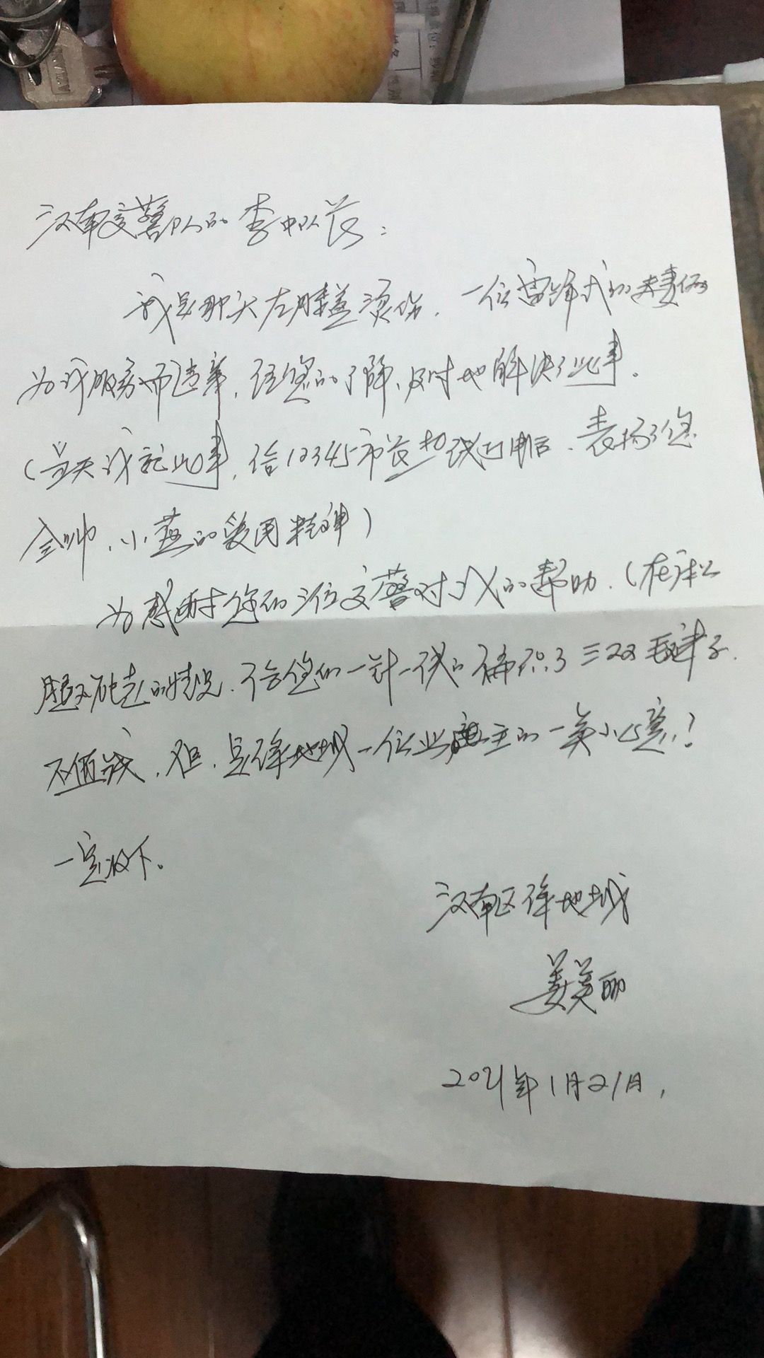1月21日中午,纱帽街居民姜美丽在儿子的护送下,专程来到武汉经济技术开发区(汉南区)交通大队纱帽中队,将自己编织的3双袜子分别赠送给纱帽中队李鹏飞、全帅和黄珍逸等3人,附带一封感谢信。