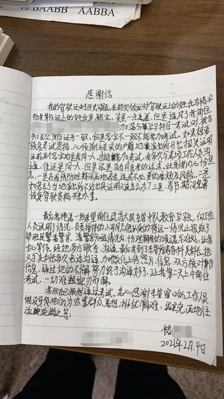 2月9日(农历腊月二十八),外地驾驶员褚某向武昌区交通大队车管中队送来一封手写感谢信,感谢交警同志热心为民服务,解决了“一点”难题。