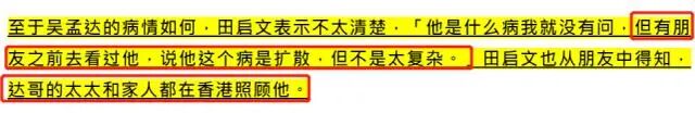 有港媒采访吴孟达的好友田启文,对方表示有朋友在医院看望达叔,他瘦了很多,需要时间休息。还透露两个月前和达叔通话,达叔生病时坦言“要走就走吧”,后来找到好的医疗团队,情况好了许多,才打电话报平安。