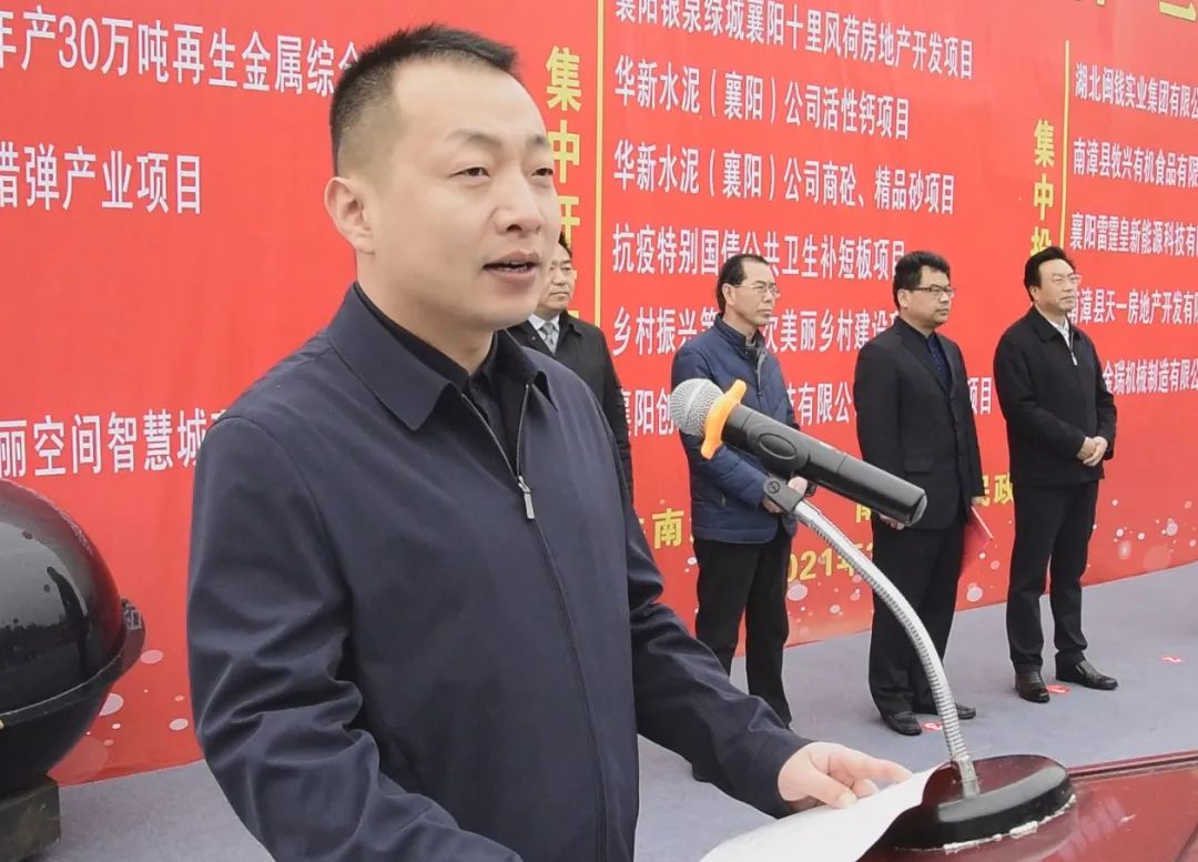 县委副书记、县长陈栋致辞,他在讲话中说,南漳将坚定贯彻落实市委、县委作风建设“服务年”要求,以政府系统“锤炼过硬作风 奋力担当作为”主题活动为抓手,进一步完善项目建设“招、落、服”工作机制,更大力度优化营商环境,当好市场主体“有呼必应、无事不扰”的金牌“店小二”,用干部的辛苦指数确保投资项目早落地、落地项目早开工、开工项目早投产,投产项目早达标、达标项目早入库,以高质量的项目投资支撑高质量发展,确保全县经济社会发展开局漂亮、全年精彩。