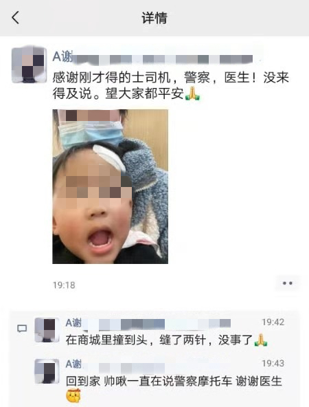 经了解,该男子姓谢,当天下午,其3岁的儿子在玩耍时不慎撞伤头部,顿时鲜血直流。谢先生赶紧叫了一辆出租车前往医院,却遇到晚高峰时段车行缓慢,当看见汉警快骑队员时仿佛看见了“救星”,便赶紧下车求助。因救治及时,谢先生的儿子已无大碍,当晚,谢先生专门发了朋友圈向出租车司机、交警、医生表示感谢。