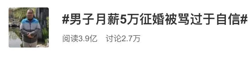 在刚刚过去的这个假期里,一名清华毕业的男子张昆玮征婚的消息上了热搜,热搜标题叫做“#男子月薪5万征婚被骂过于自信#”。