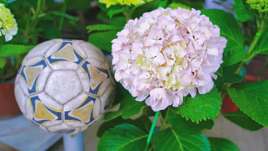 在程远惇的花园中,有一朵绣球花的直径,竟然比足球还要大!程远惇说,他用尺子量过,这朵绣球的直径达25厘米,而比赛用的标准足球,直径大约22厘米。