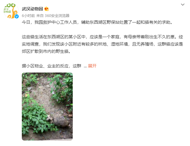 7月2日,武汉动物园发文称,东西湖区某小区中出现了国家二级保护动物貉,经实地调查,应该是郊区扩散到市内的野生貉。该小区居民反映这群貉从未伤过人。2020年,上海松江区曾发现一个野生貉种群,扩散到了多个小区当中。武汉动物园工作人员称,目前不建议抓走这群貉,可能会造成母貉弃幼或者幼体死亡,该小区居民也同意和貉和平相处,并呼吁市民如遇到貉要保持距离,请勿投喂。