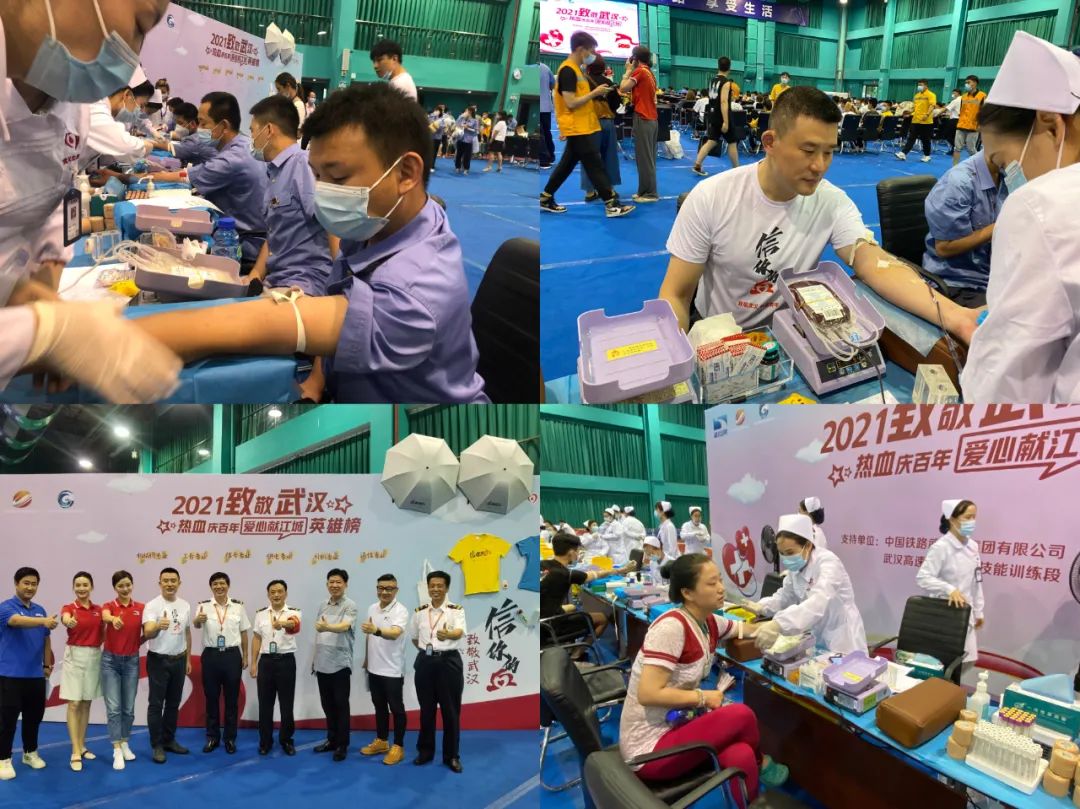 7月8日,“2021致敬武汉 热血庆百年 爱心献江城”无偿献血活动走进高铁职业技能训练段,武汉无偿献血形象大使、湖北经视主持人江涛与训练段的无偿献血者们伸出臂膀,为爱接力。