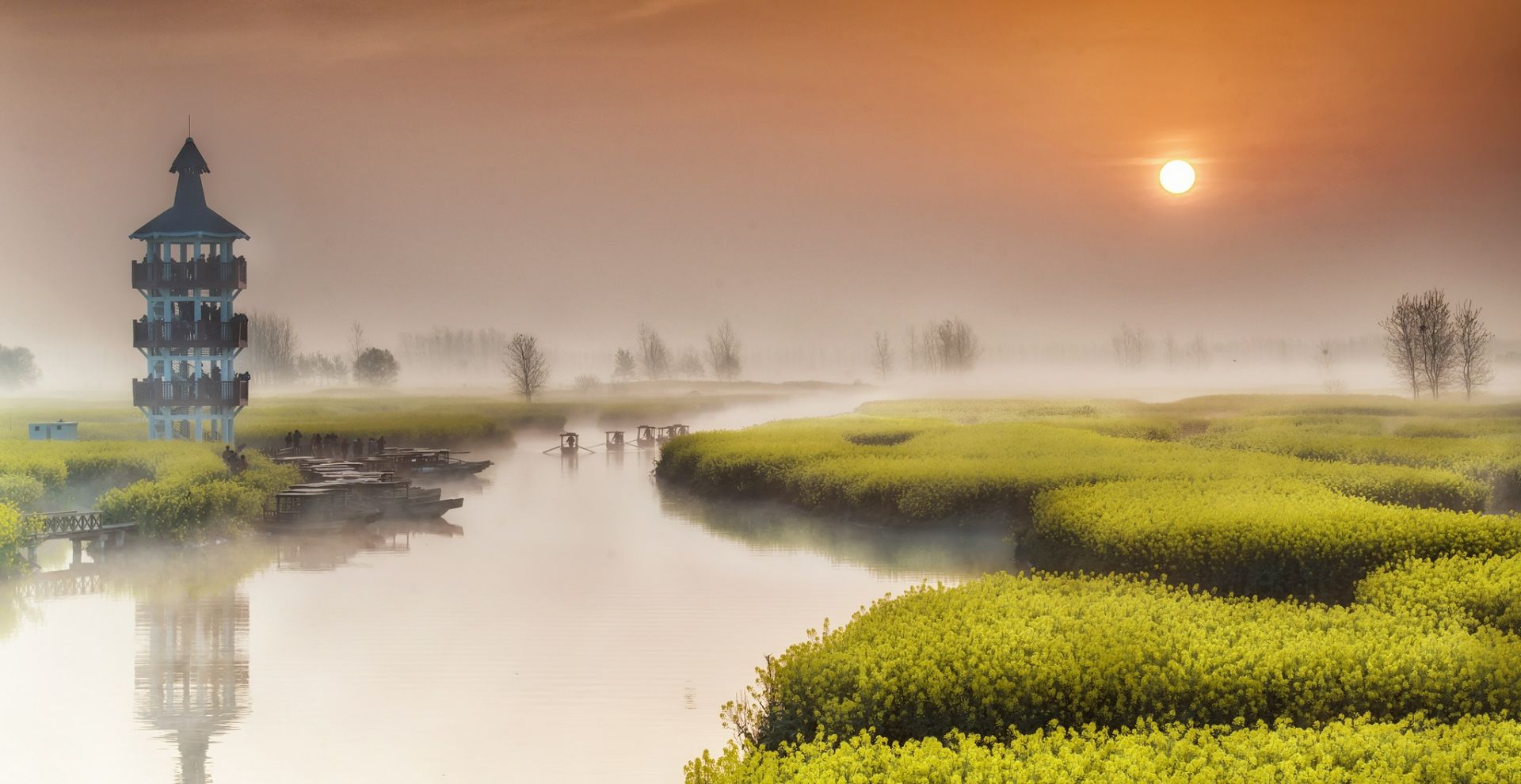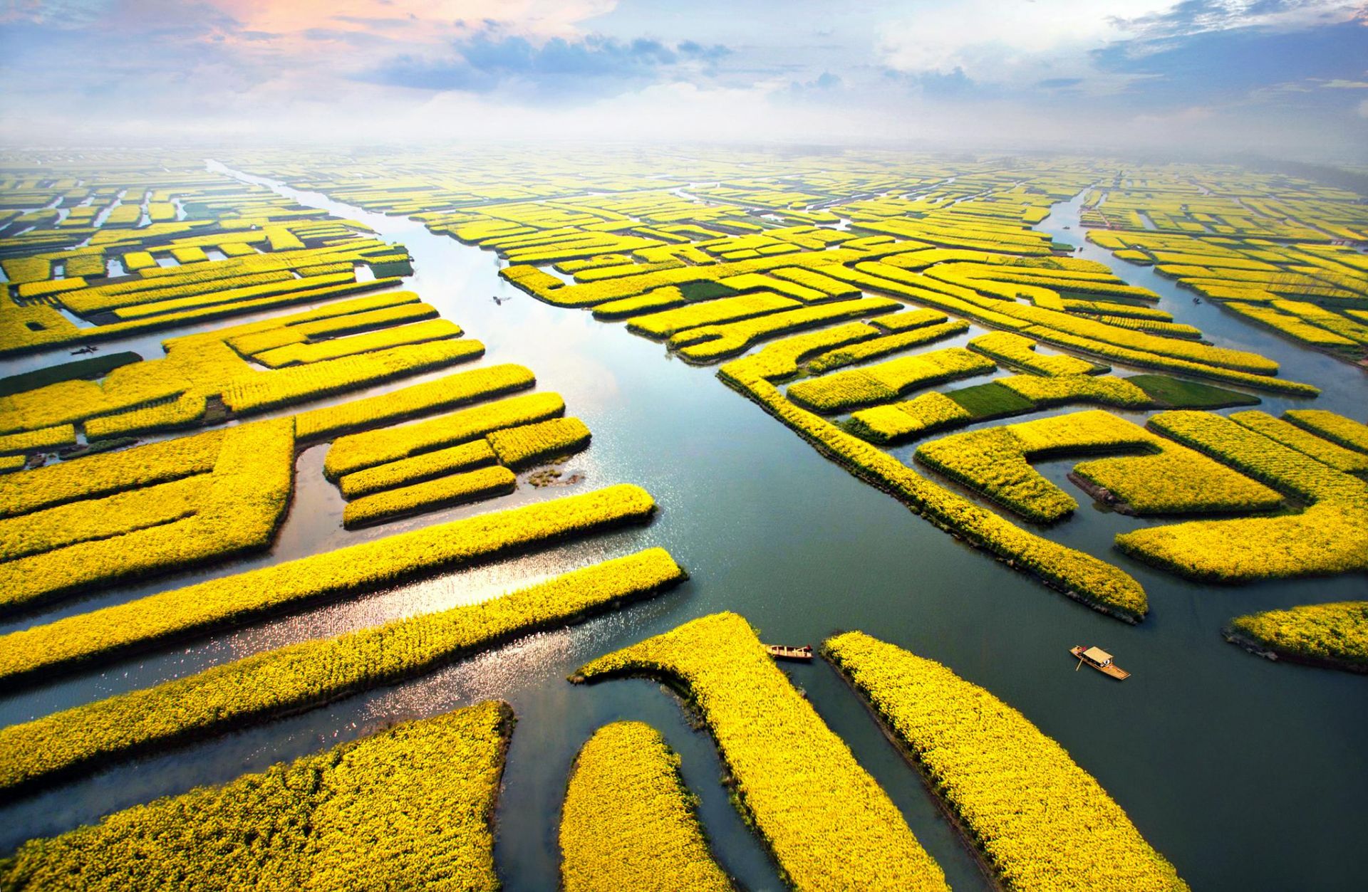 江苏兴化油菜花,位于兴化市缸顾乡东旺村,以千岛样式形成的垛田景观享誉全国。垛田大小不等,形态不一,互不相连,非船不能行。置身其中,如同走进古人摆设的水中龙门阵。传说垛田是当年泰州知州岳飞大战金兵摆设的八卦阵。每当清明前后,油菜花开,蓝天、碧水、金岛织就了“河有万湾多碧水,田无一垛不黄花”的奇丽画面。