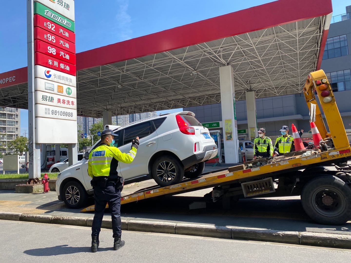 随后,民警来到姑嫂树路某加油站,看到执法人员,原本停放在加油站区域的车辆纷纷驶离,但在加油站入口处,仍有两辆停白色机动车无法联系到车主。加油站工作人员告诉民警,这两辆车今天一大早就停在这里,当时她告诉司机堵住了加油站入口,但其并不理会,锁上车门就直接离开了。民警立即调来拖车,依法将违停车辆拖移。