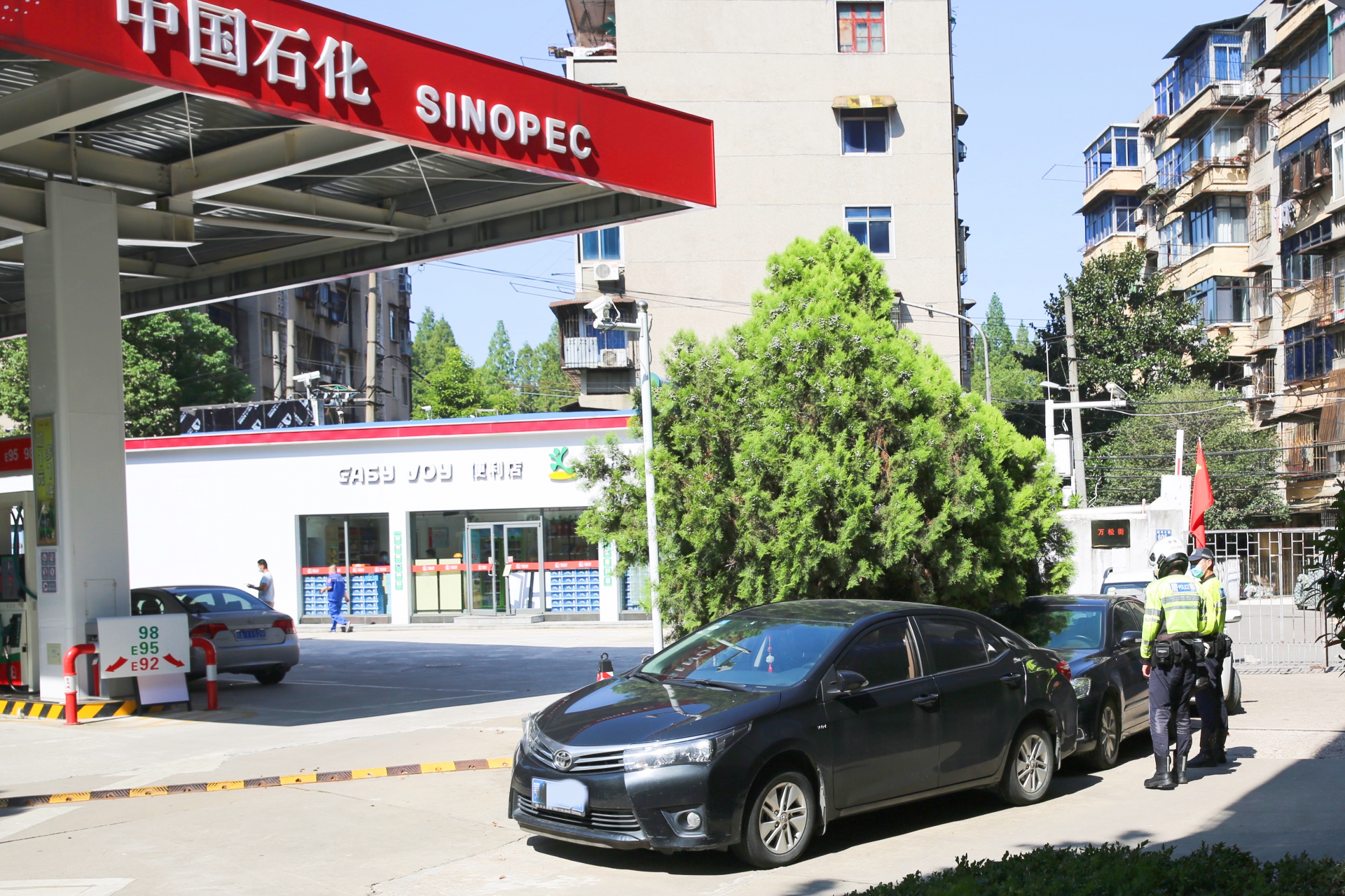 2021年8月30日,江汉区公安分局内保大队、交通大队联合对辖区加油站内的违停机动车开展集中整治行动。上午9时30分,在江汉区建设大道某加油站旁,三辆轿车占用消防通道停放,司机不知去向,旁边有不少车辆正排队加油。