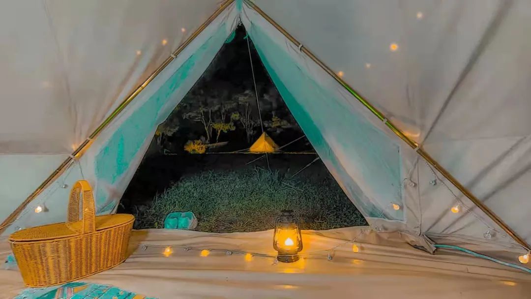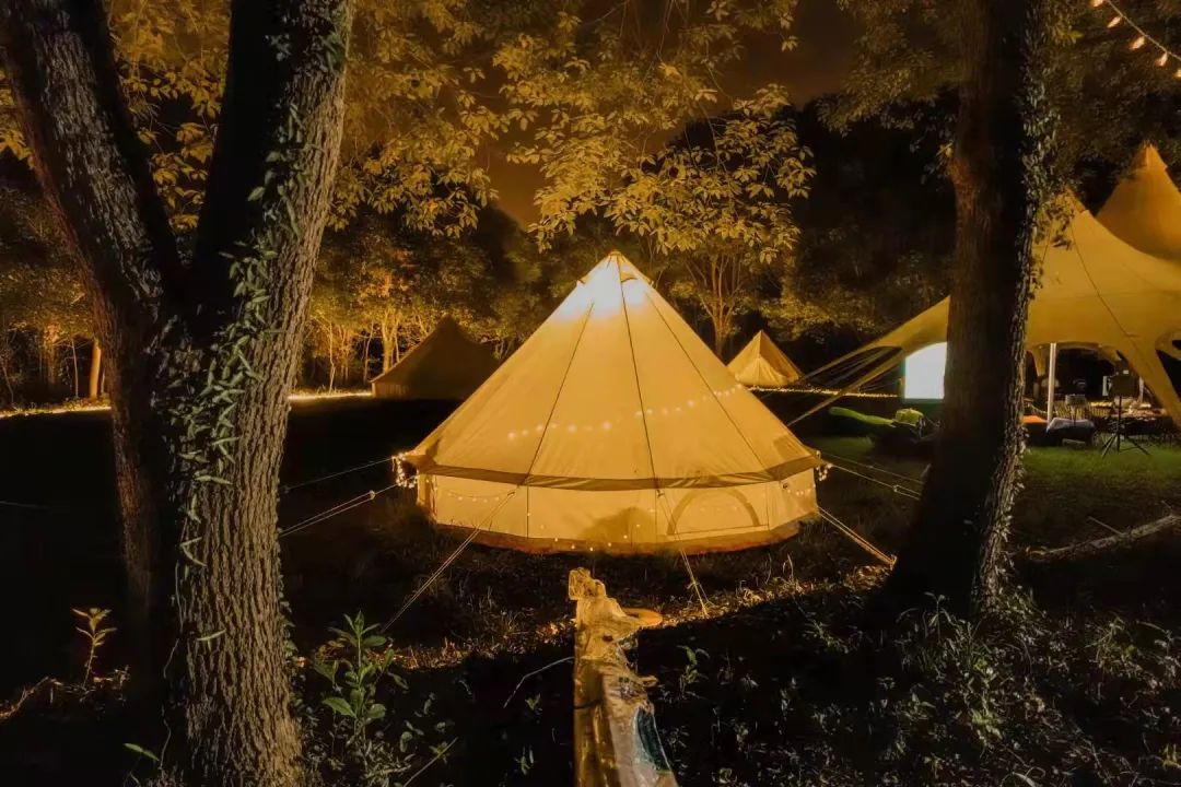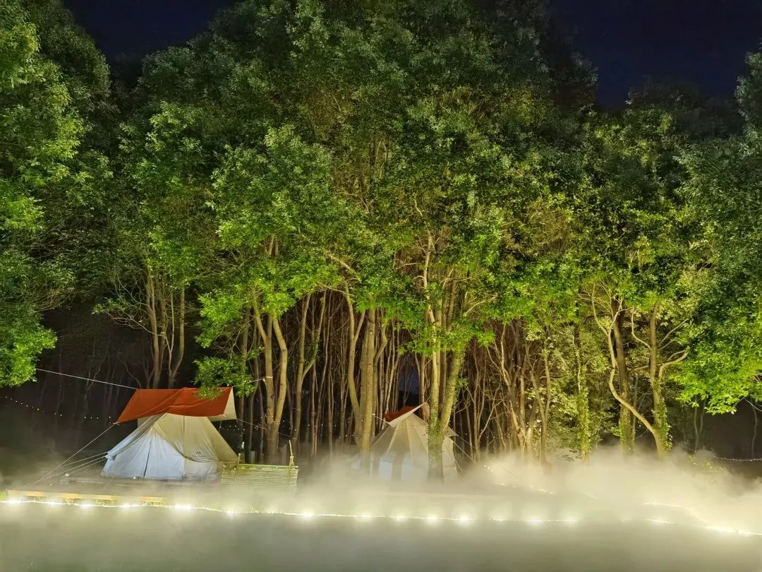 星空帐篷露营、烧烤、露天电影、许愿荷灯……傍晚时分,灯光亮起,气氛拉满,聊着天,吃着烤肉,别有一番风味。