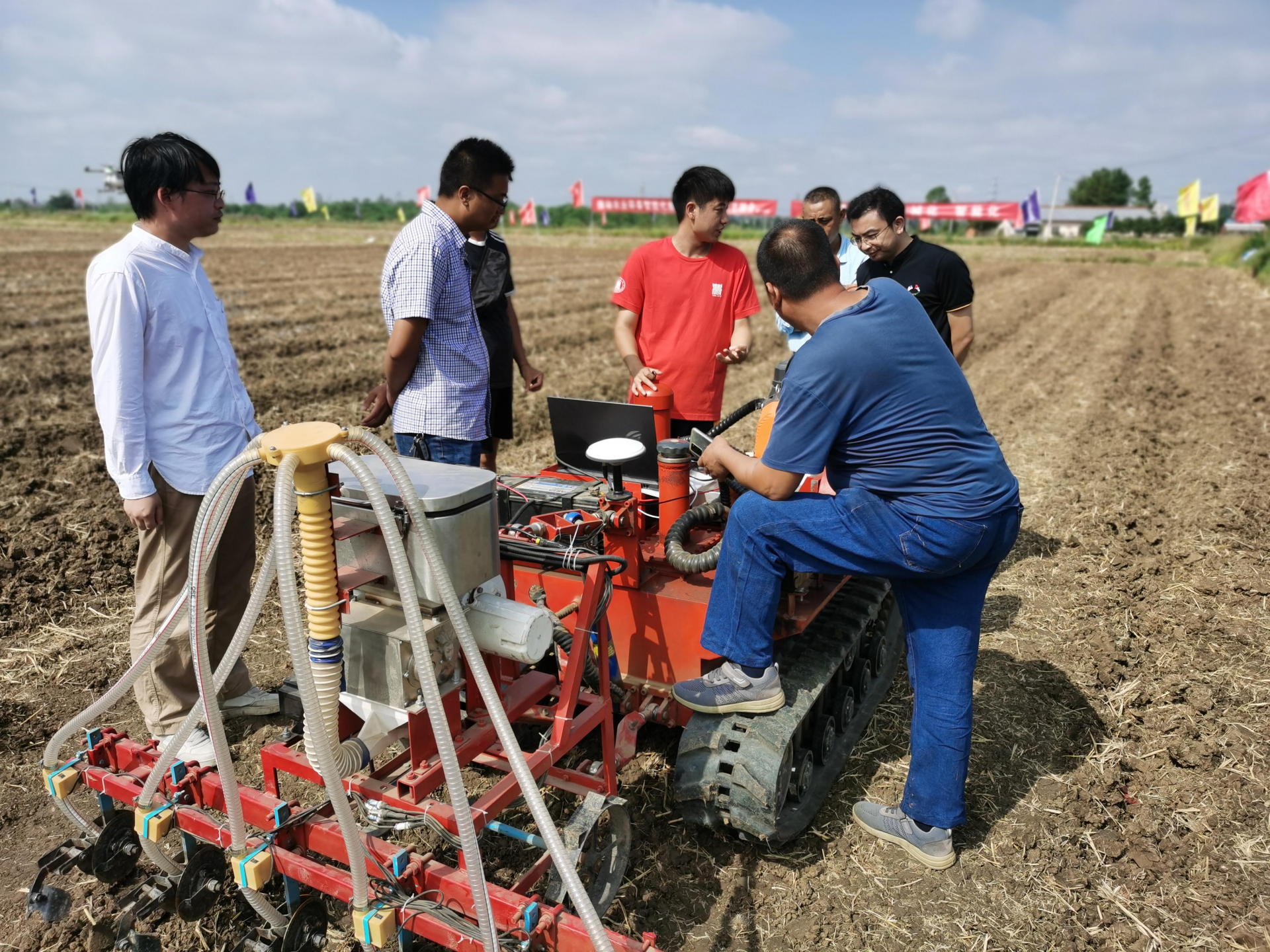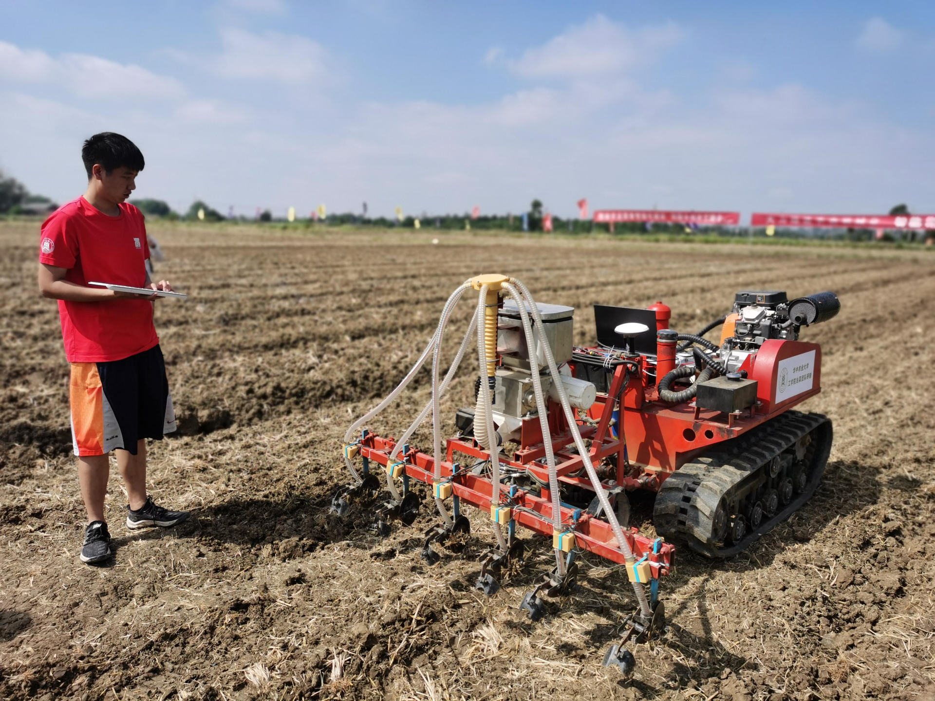 华中农业大学研究生手拿键盘操作全液压气送式履带油菜无人播种机