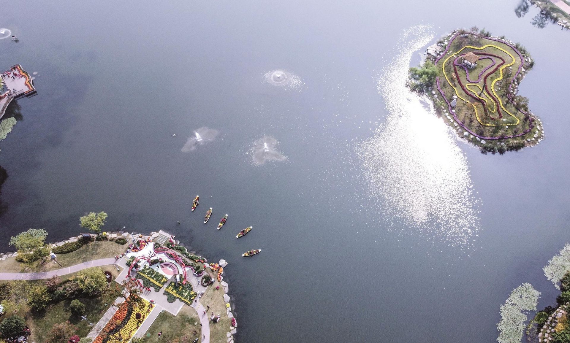 来到武昌紫阳湖畔,湖边由一盆盆“满天星”菊花镶边,红黄相映,夺目耀眼。湖中漂着一艘艘花舟,一条条彩色花带点亮湖心岛。空中俯瞰,菊花给紫阳湖公园上了自然彩妆。