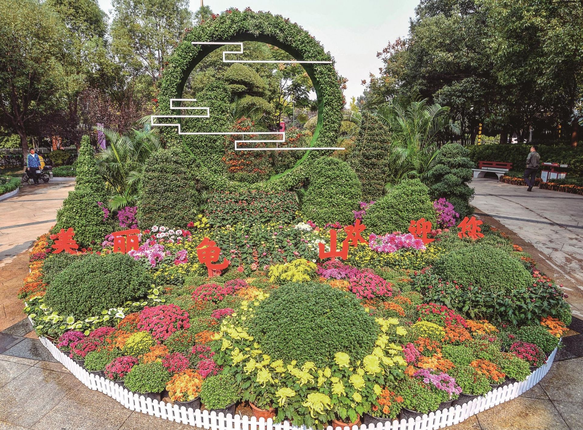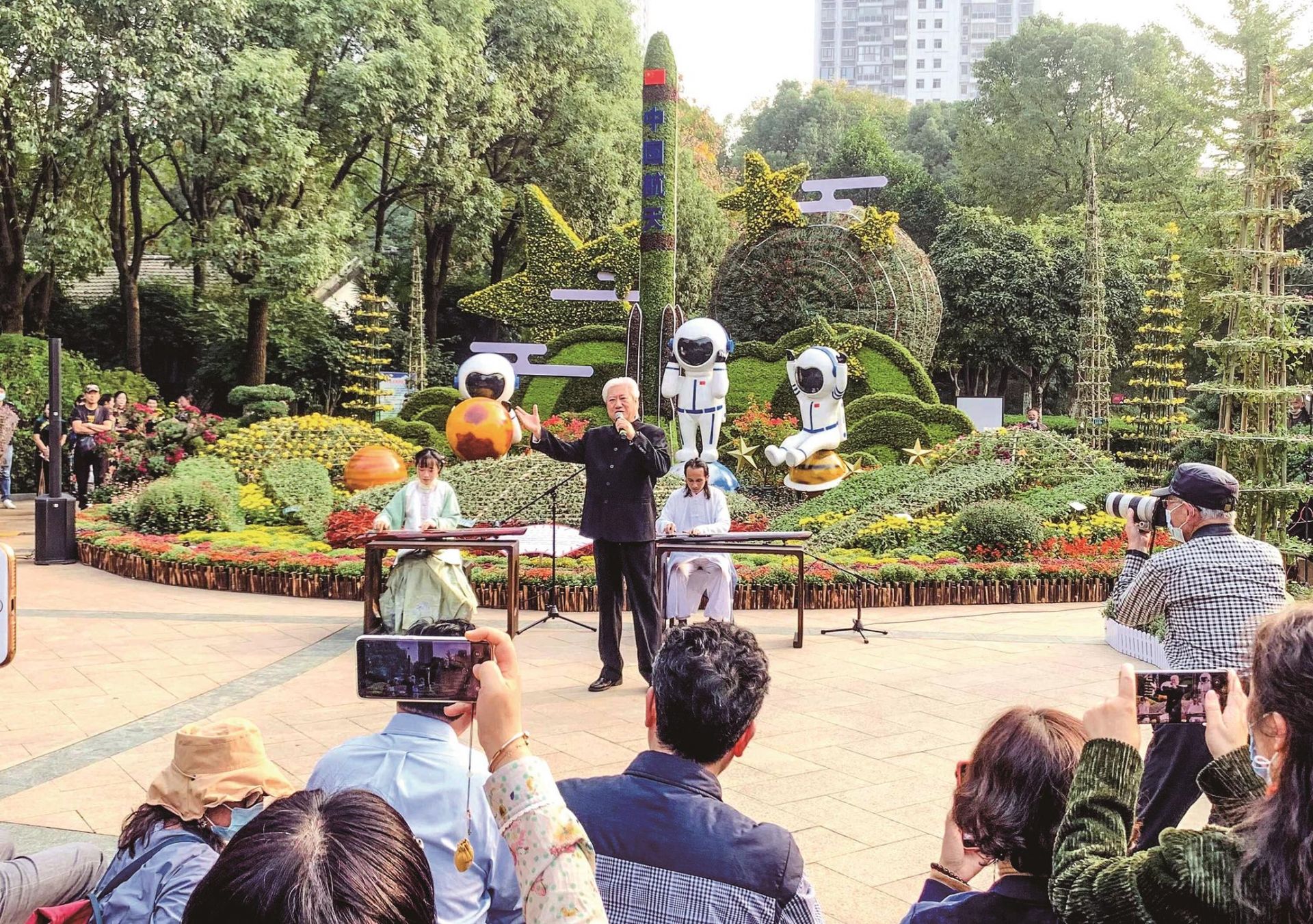 喷泉欢跃,花香浮动,约12万盆600余种菊花在此一展芳华,“中国航天”的扎景气势磅礴,还有或粉或紫三角梅一旁添彩。