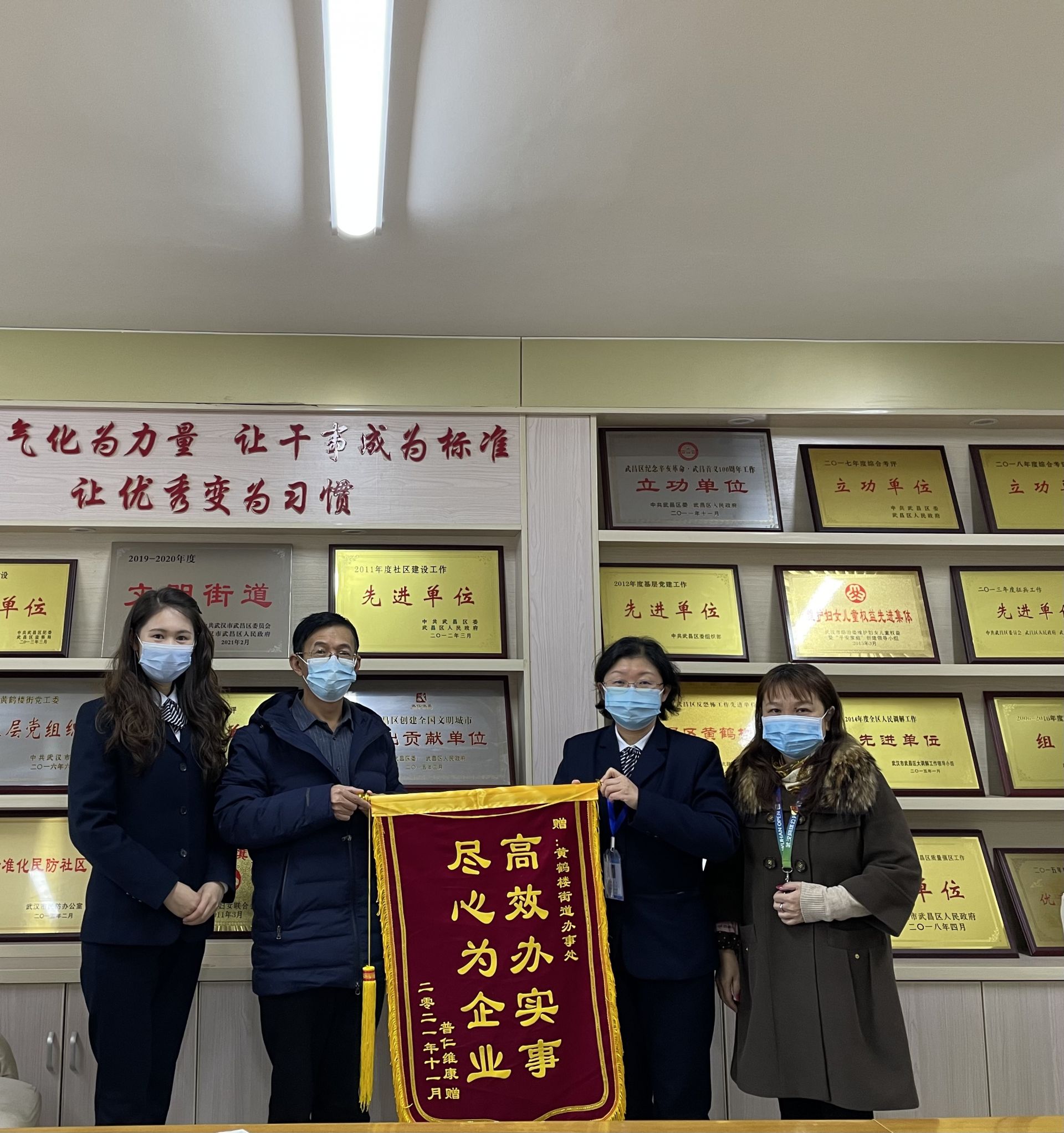 高效办实事,尽心为企业。11月24日,武汉市武昌区黄鹤楼街道收到一面来自武汉市普仁维康医疗养老有限责任公司的锦旗,“自从我们打算在黄鹤楼街道开展养老网点建设以来,街道对我们公司的各项工作都给予了很大的支持,效率高,服务好,为你们点赞。”