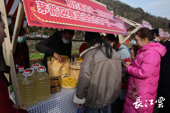 活动现场,当地还举办了年货展销推介,周边村民将自家的猪肉、苞谷酒、拐枣酒等十多种农特产品摆上货架,吸引了不少游客前来购买。当天,营子村共销售近50万元,阳坡村、小川村、黄家村、锅厂村等4个村也销售丝瓜、中药养生枕头、黄酒等近10万元。