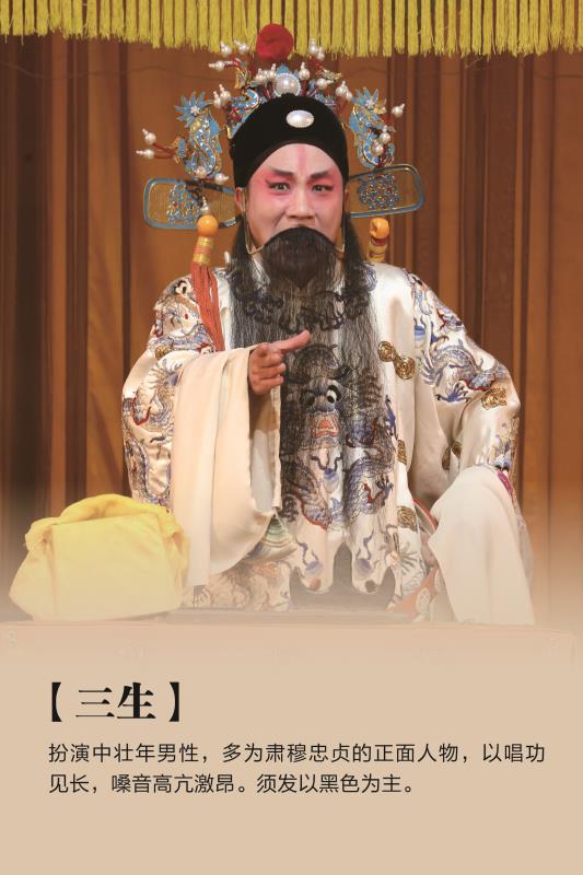 三生即正生,唱做兼重,在元代杂剧中,为主唱之正末,在元朝传奇中则为生。明徐渭曰:“生,即男子之通称也”。《椒生随笔》谓:“生者此戏文所由生也,故为剧中之主干。”云集山人谓:“生为书生之简称,言其文雅也”。