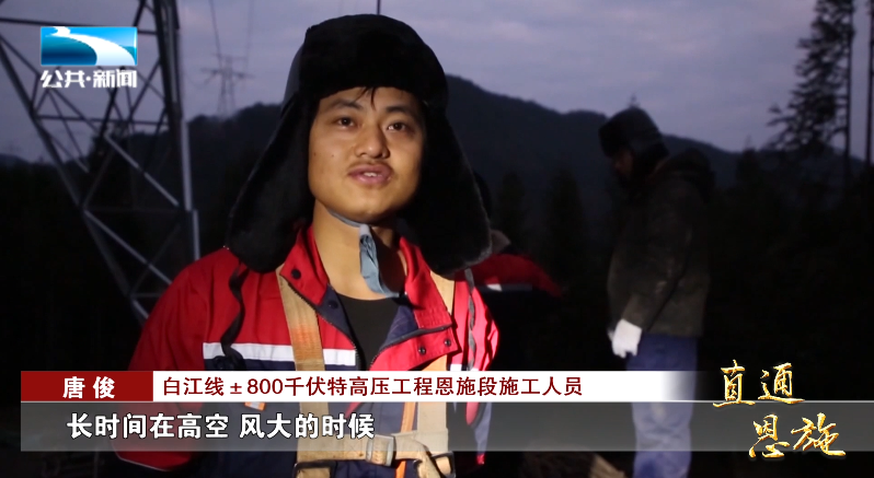 白江线±800千伏特高压工程恩施段施工人员 唐俊:“长时间在高空,风大的时候,脸上被风吹得受不了,我这个帽子外面是毛的,里面是不锈钢的,既能保障安全也能保暖。”