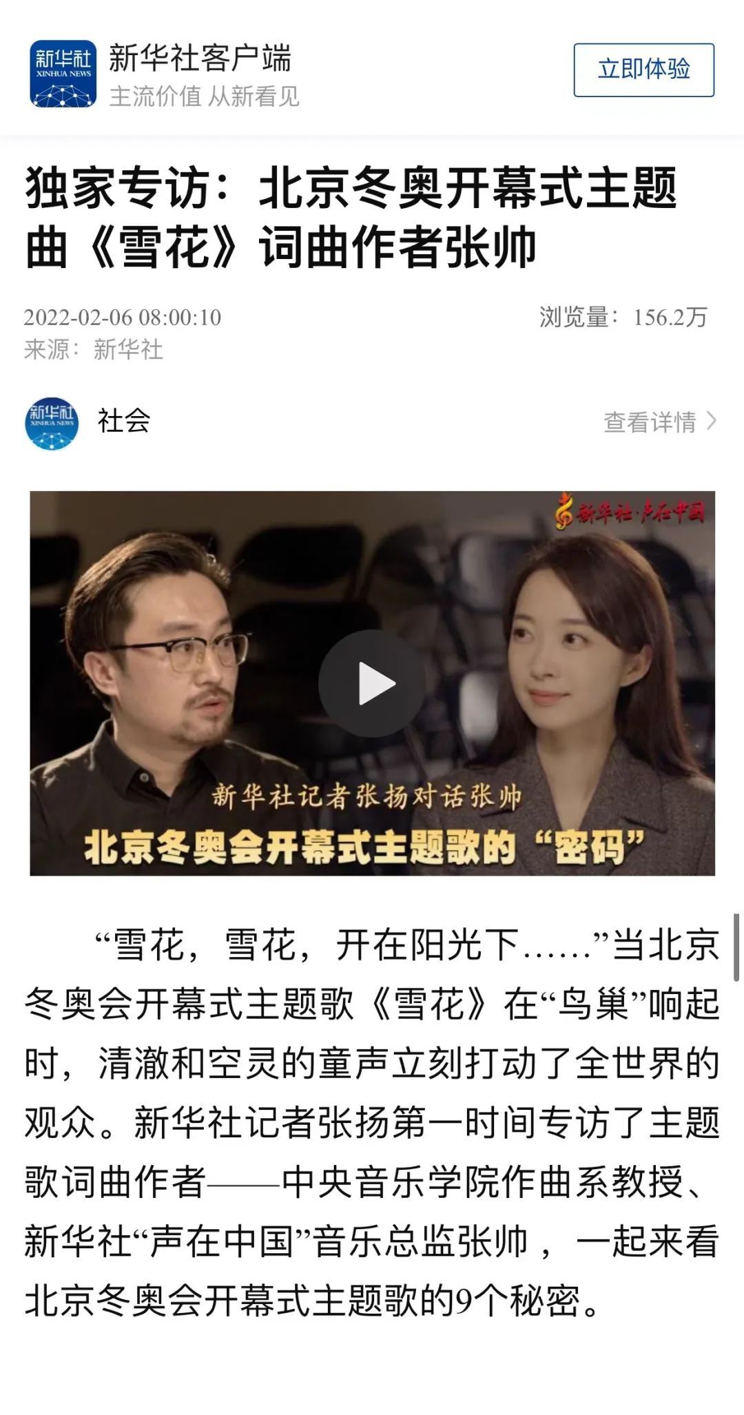 2月4日晚,举世瞩目的第二十四届北京冬奥会开幕式在国家体育场隆重举行。由中央音乐学院作曲系教授张帅创作词曲的《雪花》作为开幕式主题曲响彻“鸟巢”,打动了全世界的观众。特此转载新华社对张帅教授的独家专访,以飨读者。