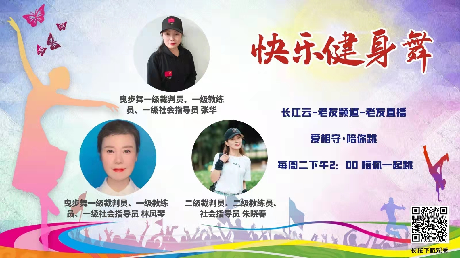 3月29日14:00——15:30湖北广播电视台湖北之声、长江云老友频道《老友直播》,主播草莓邀请曳步舞一级裁判员、一级教练员、一级社会指导员张华,曳步舞一级裁判员、一级教练员、一级社会指导员林凤琴,二级裁判员、二级教练员、社会指导员朱晓春,带领老友们跳舞健身,共享健康生活,以最优雅的状态,遇见最美的自己。参与直播间互动,还有精美礼品等您来拿!