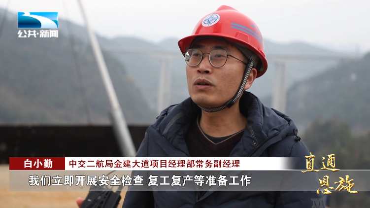 中交二航局金建大道项目经理部常务副经理 白小勤:“我们是正月初九到达建始工地,到了工地之后,我们立即开展安全检查、复工复产等准备工作,抓进度、保质量、保安全、出生产,确保工程建设的开门红。”