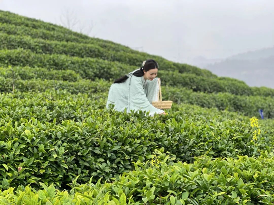 花乡茶谷茶田面积有9000多亩,采茶时节也是蔷薇花盛放的时候,茶香混着花香扑面而来,清新又浪漫。站在半人高的茶园中,就能以山和蓝天为背景拍照,风吹过裙子,相当美丽。