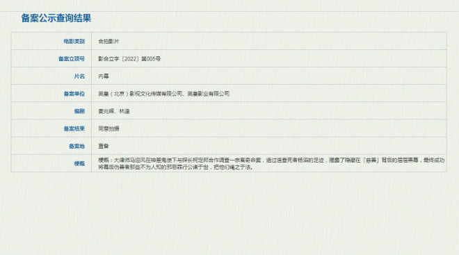 近日,国家电影局2022年2月全国电影剧本(梗概)备案、立项公示,由麦兆辉编剧、执导的电影《内幕》已正式立项,备案单位:英皇(北京)影视文化传媒有限公司、英皇影业有限公司。