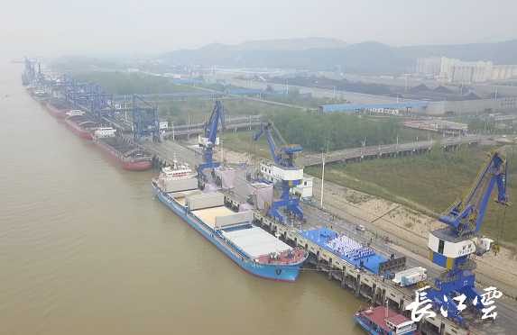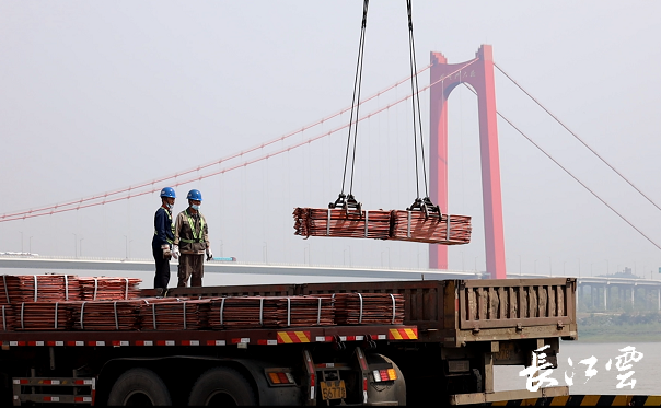 4月20日,在黄石新港码头上,多式联运呈现出喜人的发展态势,22号泊位的6号卸船机正在不停作业,把来自江浙的铜精矿源源不断送往大冶有色。7号吊机忙着将大冶有色生产的阴极铜,吊装装船后发往全国各地。