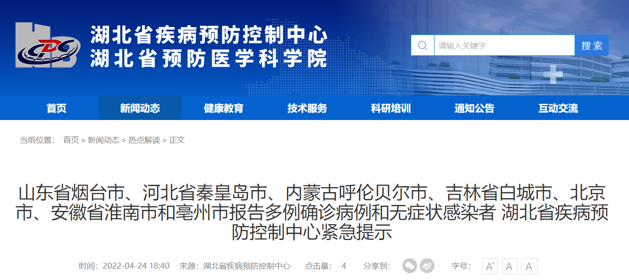 山东省烟台市、河北省秦皇岛市、内蒙古呼伦贝尔市、吉林省白城市、北京市、安徽省淮南市和亳州市报告多例确诊病例和无症状感染者 湖北疾控紧急提示