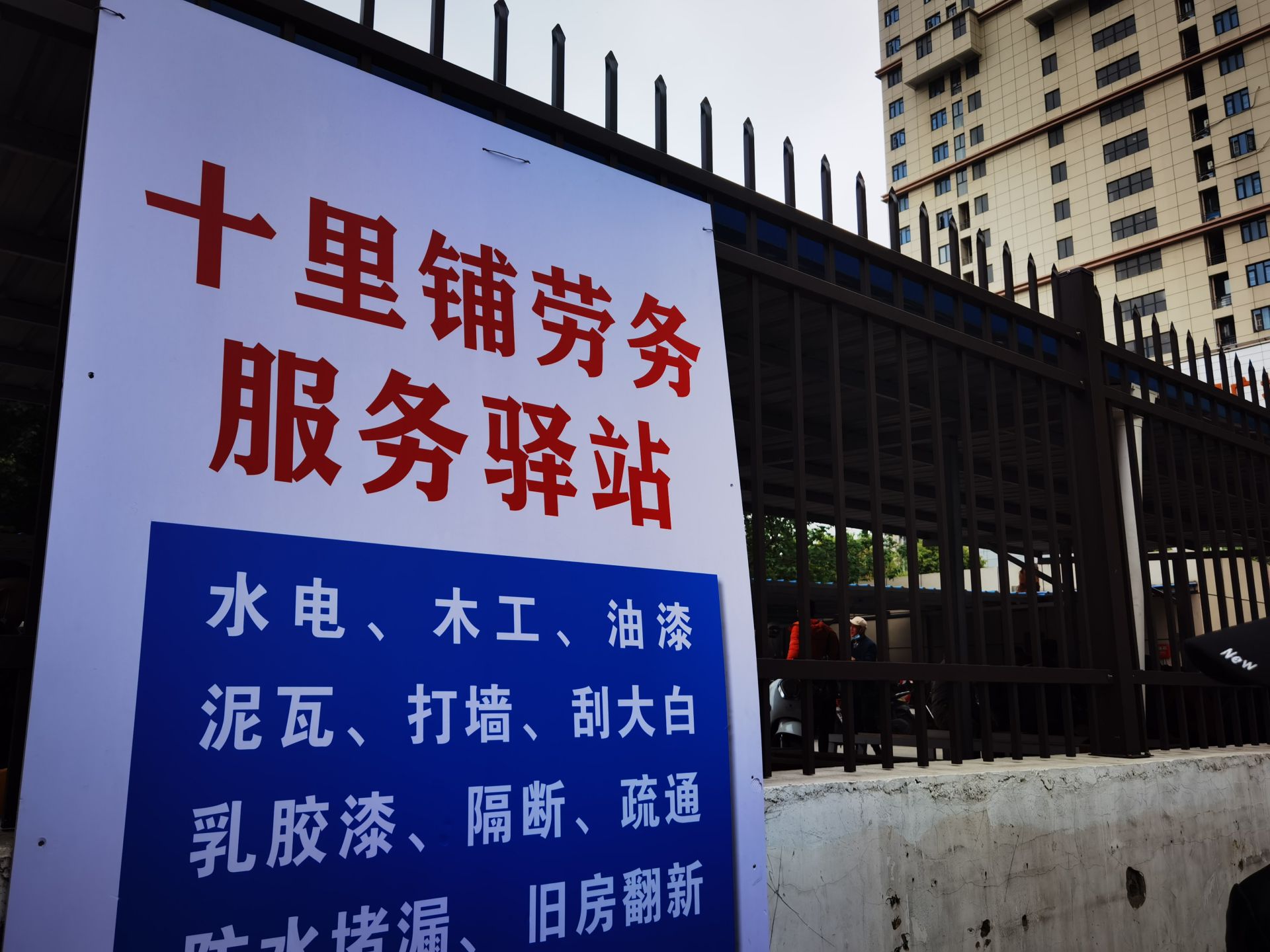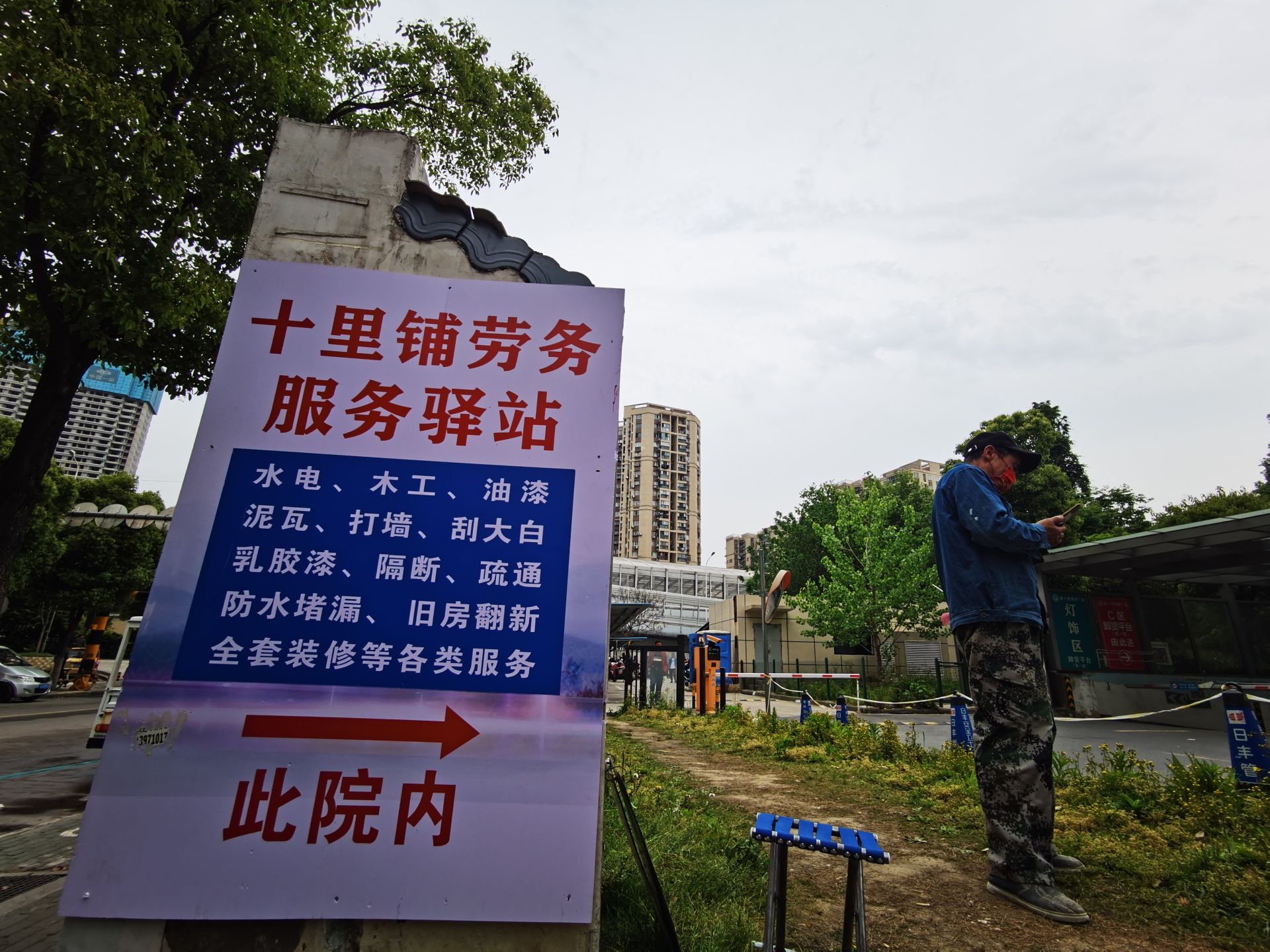 4月21日中午,油漆工向再柱回到了位于武汉市汉阳区新十里铺建材家居装饰广场旁边的十里铺劳务服务驿站午休。51岁的向再柱来自湖北黄梅,从事油漆工有近30个年头,上世纪90多代末开始,他就在十里铺装饰装潢市场做工。2019年6月,老市场搬迁,向再柱和上百位工人一起迁到新市场,他们带着一块块写着管道工、电工、泥工等自制的招牌,每天聚在十升路上招揽生意。对于被批评为“马路游击队”,向再柱也很无奈,毕竟,只有背靠着建材市场才有活儿干。
