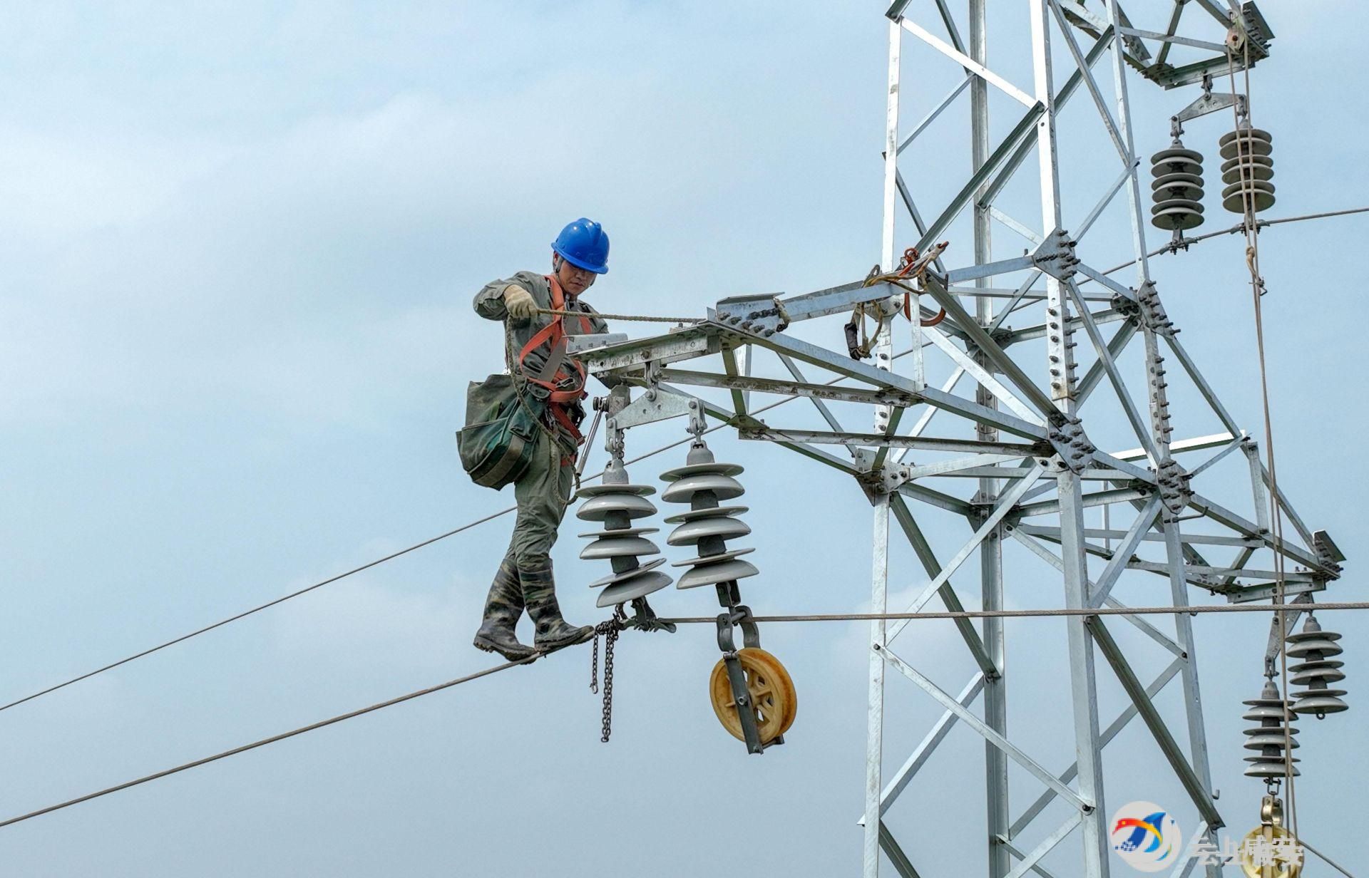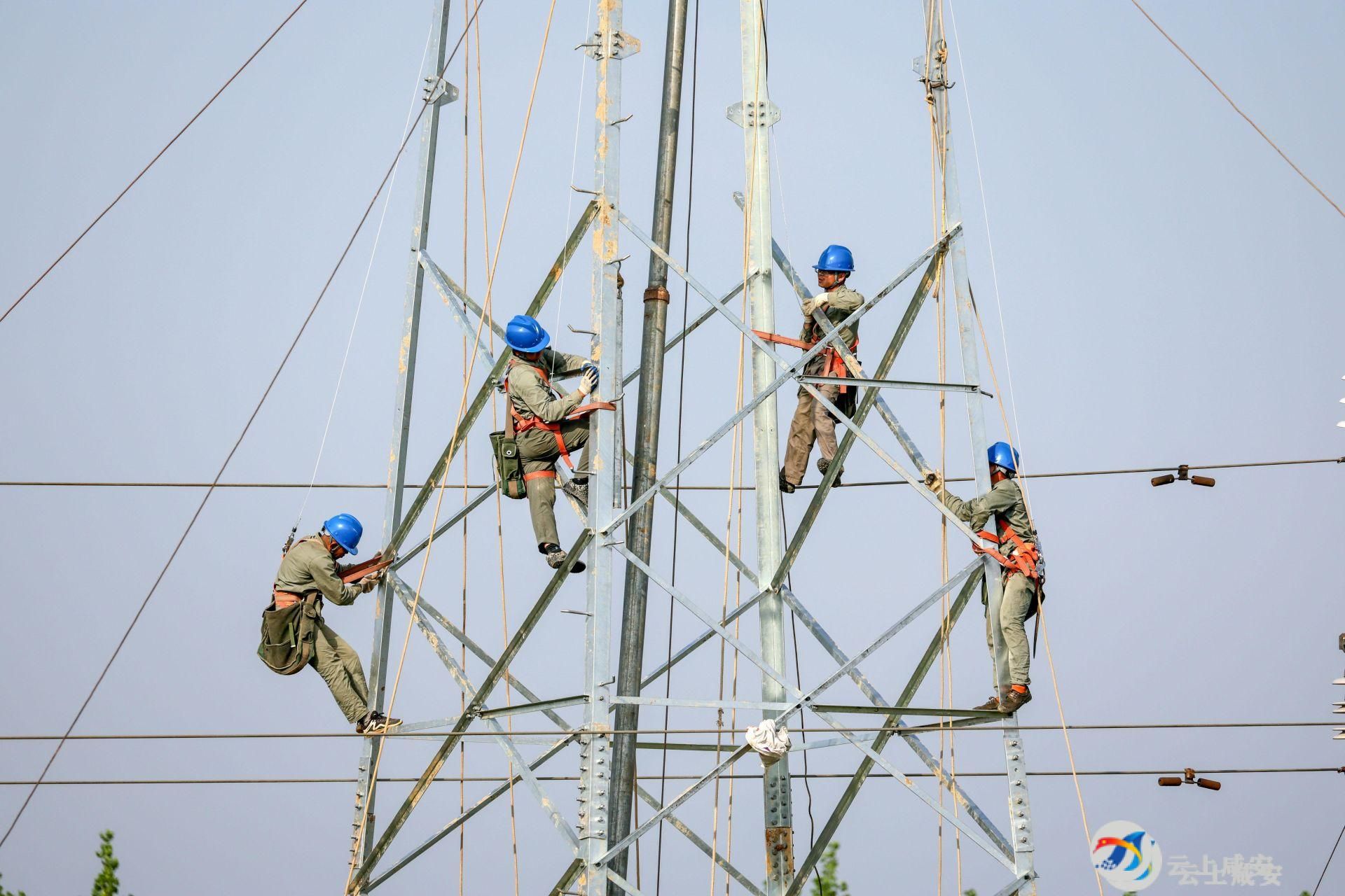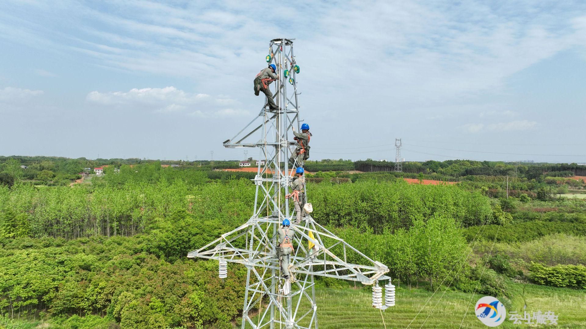 近日,在咸安区官埠桥镇官埠大道旁,咸安供电公司施工队正在架设高压铁塔和跨路面高压线。