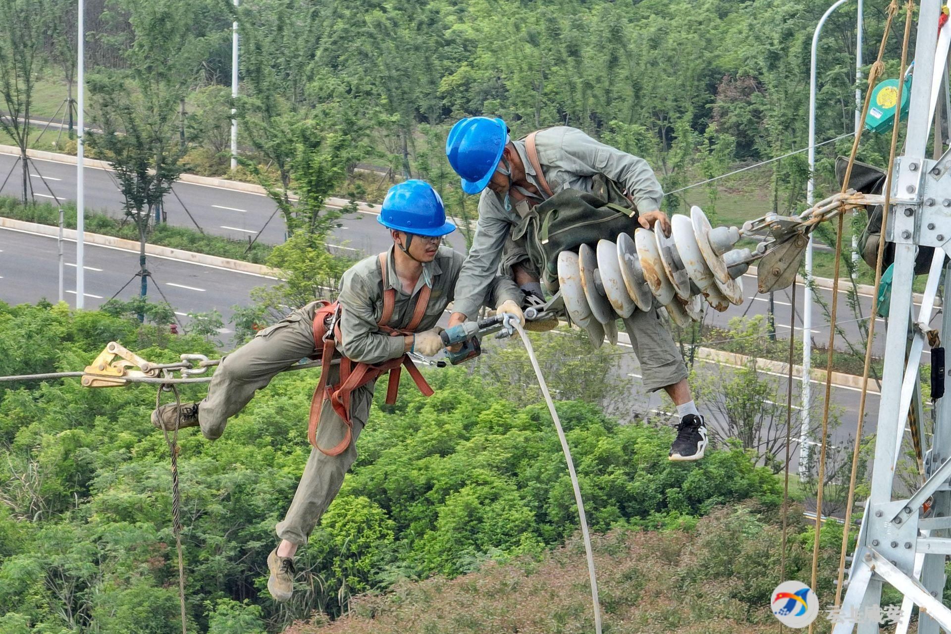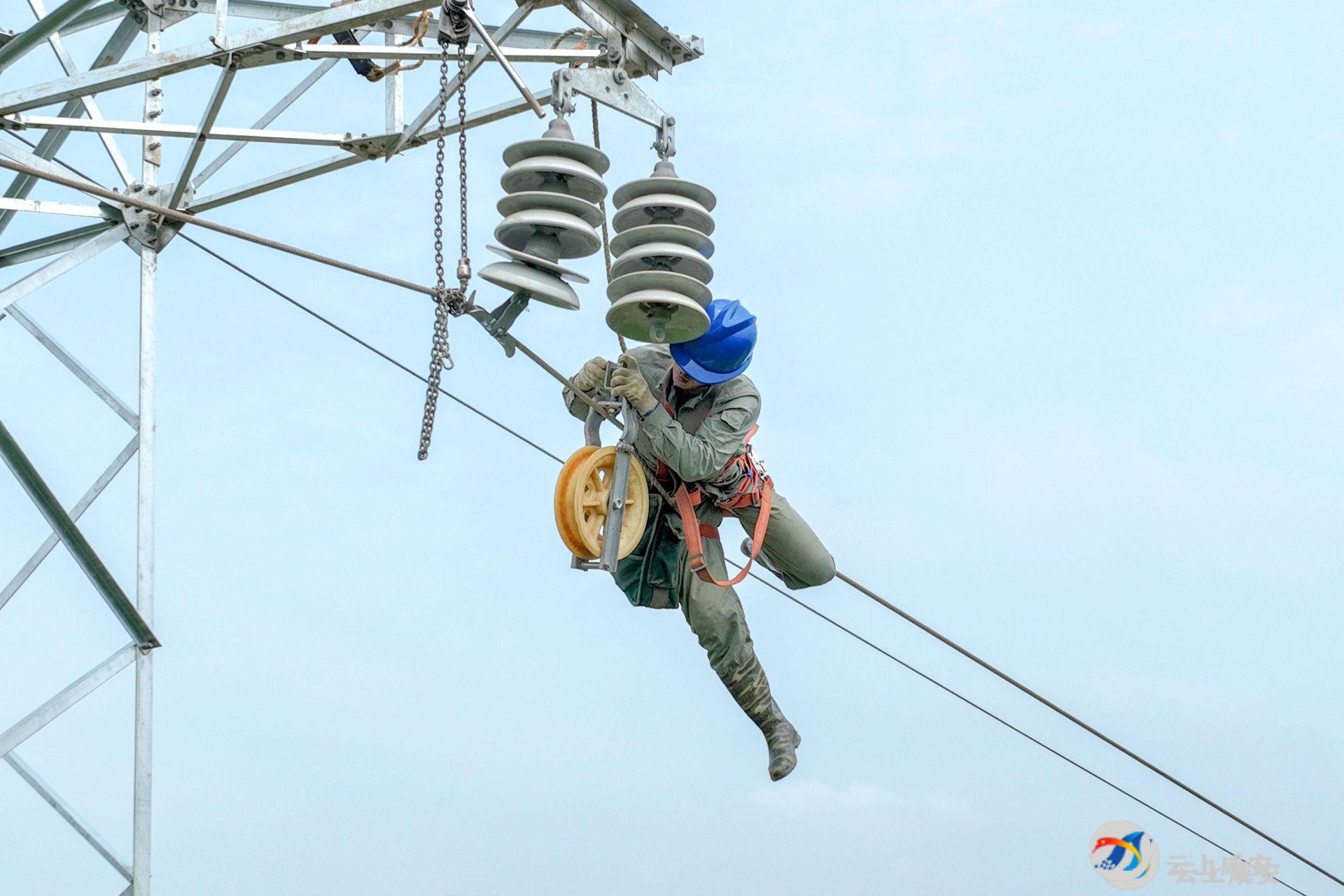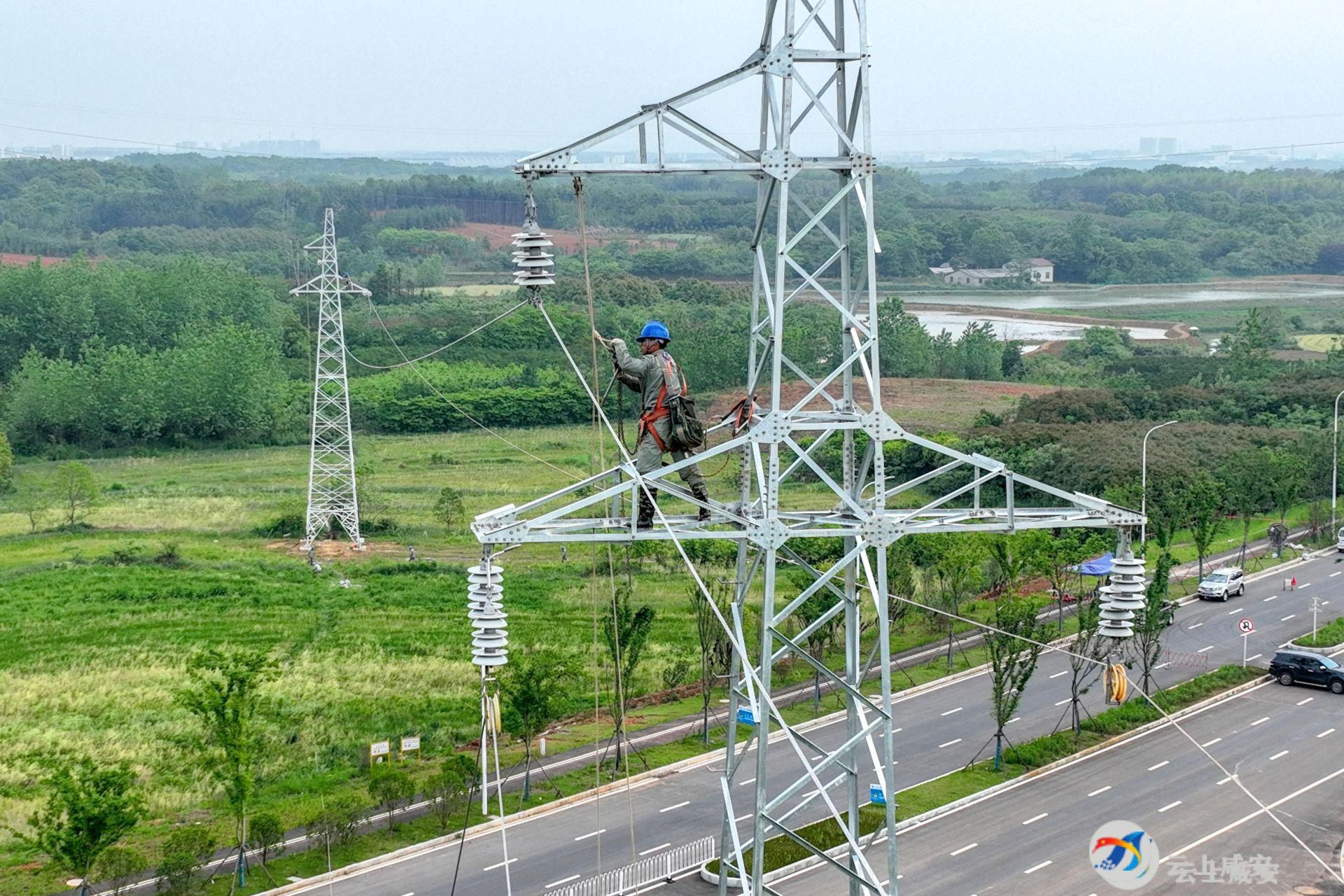 近日,在咸安区官埠桥镇官埠大道旁,咸安供电公司施工队正在架设高压铁塔和跨路面高压线。