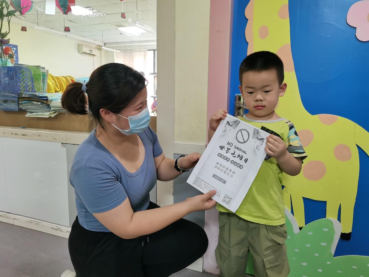 同时,网格员也深入到商户进行宣传,“禁止吸烟,从娃娃抓起”,社区到叮咚泉幼儿园宣传世界无烟日,讲解吸烟和被动吸烟对人体及自然环境的危害,并向居民发放宣传册,让小朋友了解吸烟有害健康及控烟禁烟的重要性。