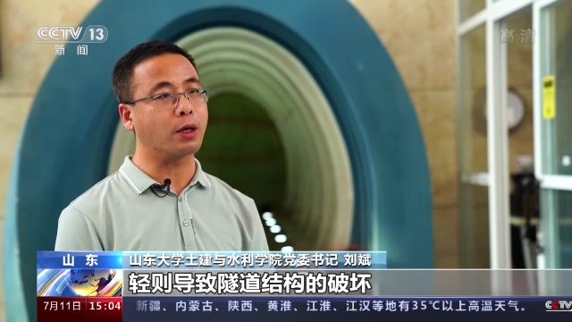 山东大学土建与水利学院党委书记 刘斌:一旦发生透水事故的话,轻则导致隧道结构的破坏,工期的延误,如果严重的话可能会出现一些严重的安全事故。我们所研发的技术是这种搭载在隧道掘机上的不良地质超前探测技术和装备。打个比方来说,我们的技术就像给汽车安上车灯,可以探明前方的不良地质。