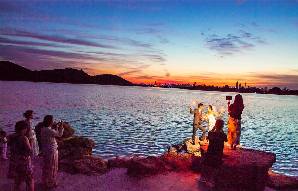 8月7日,夕阳西下时,武汉东湖落雁景区芦洲古渡湖岸边,新添的“叠石观涛”景点,叠石形态各异,像海边的樵石,众多游人站在石上静静等一场金色日落,徐徐清风,夕阳余晖照映湖面,画面颇为壮观。