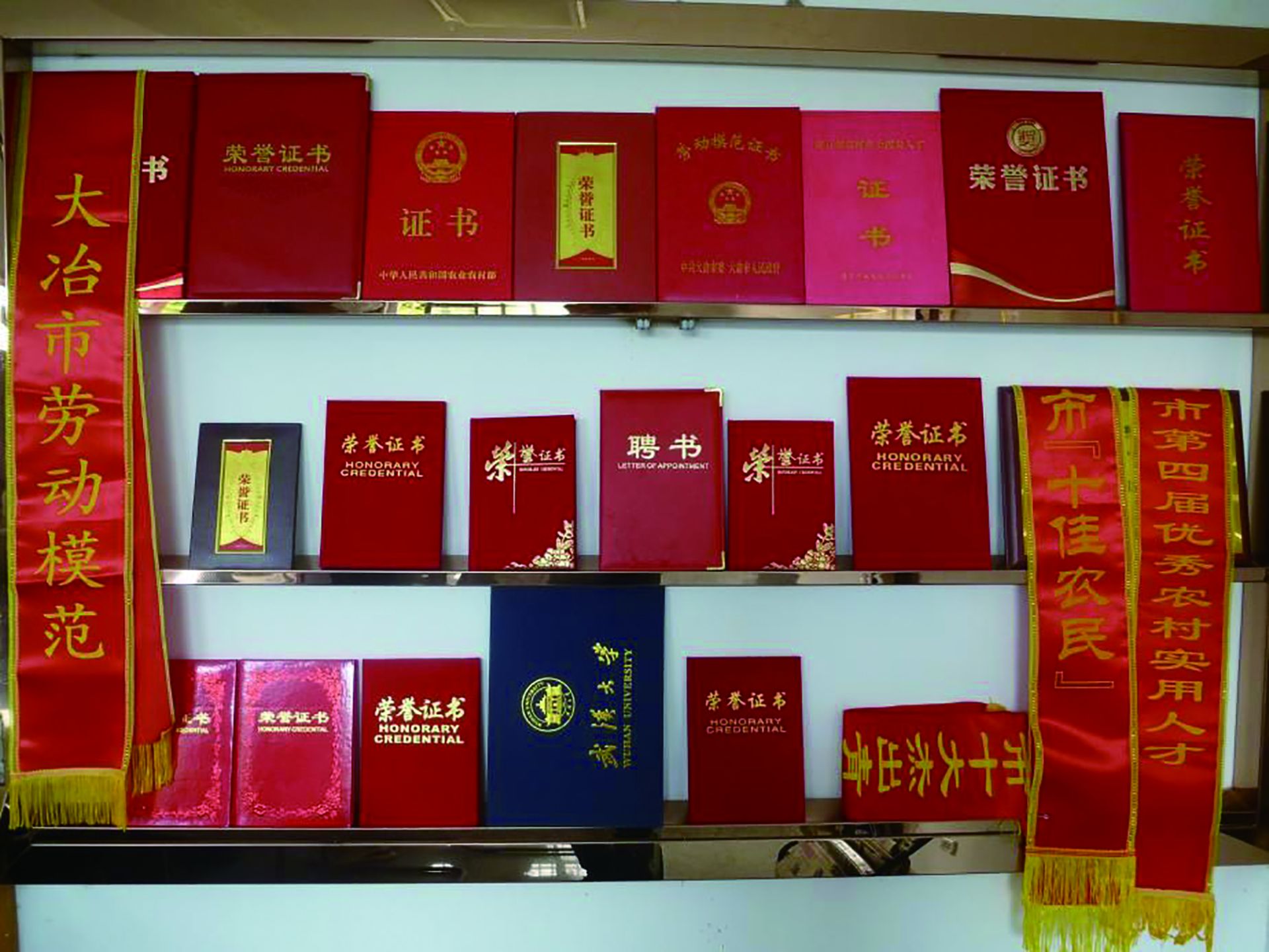 全国农机使用一线“土专家”、黄石市农村乡土“拔尖人才”、“全省农机合作社示范社”……正因为彭易权的默默奉献、艰苦拼搏精神,他和他的合作社获得了不少殊荣。记者在他的办公室看到,一面墙柜摆放着满满当当的奖牌奖状和荣誉证书,这些都是对他这些年一路披荆斩棘、坚守初心的肯定。