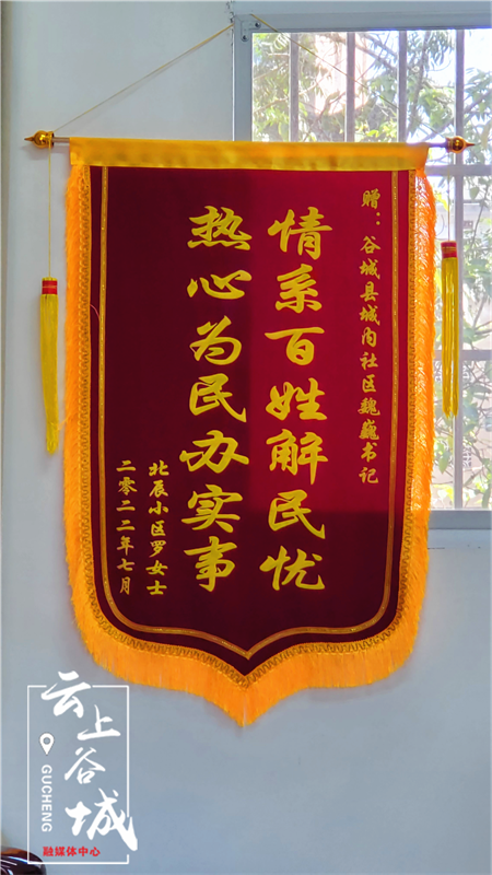9月5日一大早,谷城县城关镇城内街社区上演暖心一幕,北辰小区居民代表罗芳送来一面印有“情系百姓解民忧 热心为民办实事”的锦旗,感谢社区高效解决小区居民用水难问题。