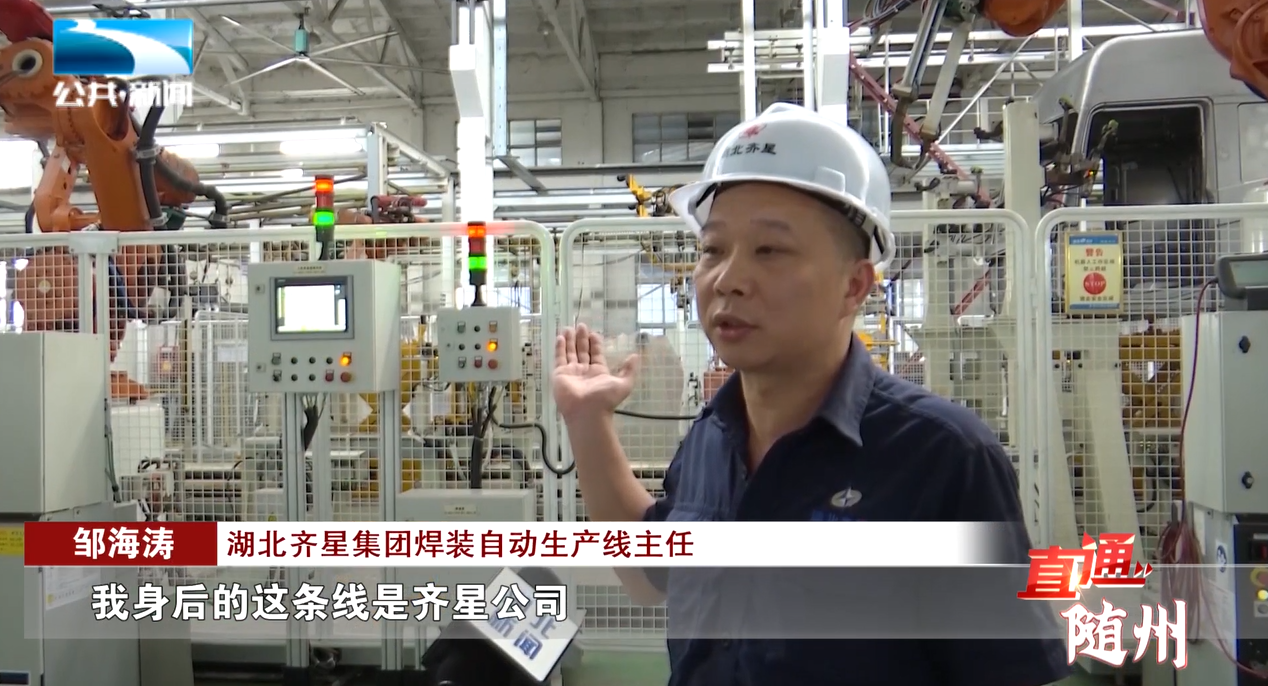 湖北齐星集团焊装自动生产线主任 邹海涛:“我身后的这条线是齐星公司最新的一条重卡拼焊线,此拼焊线线速达到五分钟一台日产120台以上,目前有30台机器人作业,后期将再投入14台机器人。”
