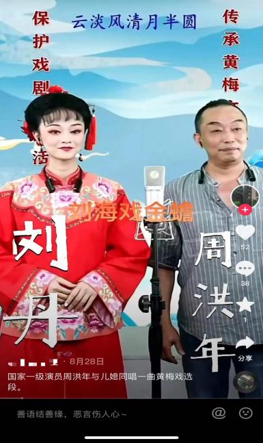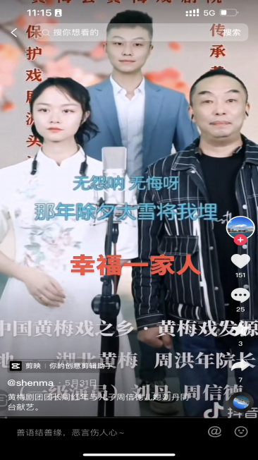 今年9月以来,周洪年老师带领儿子、儿媳(周信德、刘丹)在抖音开通了直播间,每天晚上人气爆棚,最高近5000人在线观看直播。周洪年老师不仅仅儿子、儿媳在黄梅戏剧院从事黄梅戏表演工作,其孙子“小米宝”只有3岁左右,每天都跟着“爸爸、妈妈、爷爷”一起,从早到晚在黄梅戏剧院学黄梅戏,表演的还有模有样,非常可爱。一家三代都热爱黄梅戏,传承需要这种热爱,黄梅戏的未来才大有可期!
