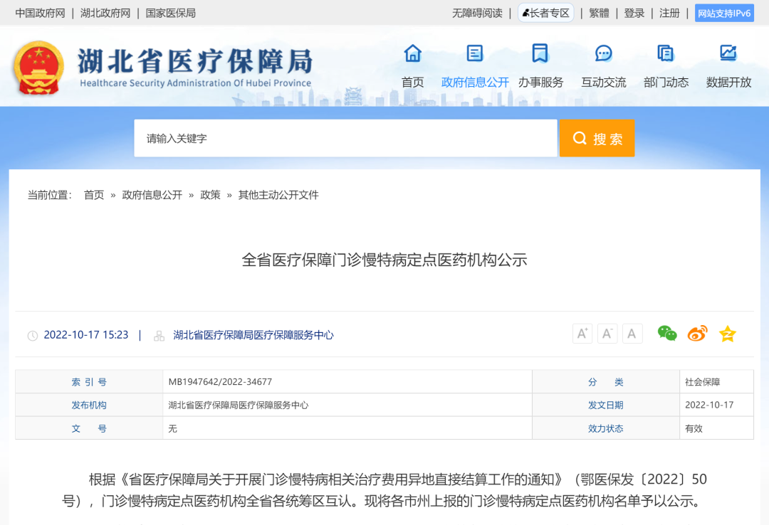 今年8月,湖北省医疗保障局就湖北省门诊慢特病相关治疗费用异地直接结算工作发出通知,其中明确了:2022年底前,湖北省各市州实现高血压、糖尿病、恶性肿瘤门诊放化疗、尿毒症透析、器官移植术后抗排异治疗门慢特费用跨省直接结算;各市州实现本统筹区全部门诊慢特病病种费用省内异地就医直接结算。