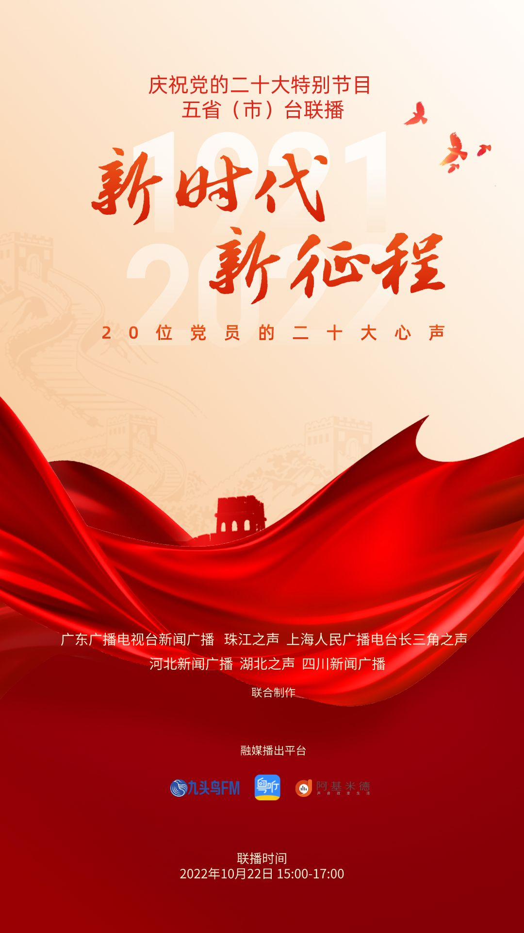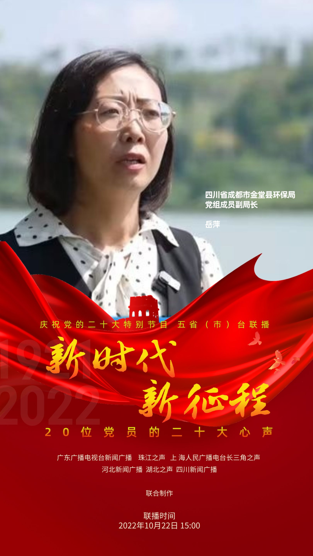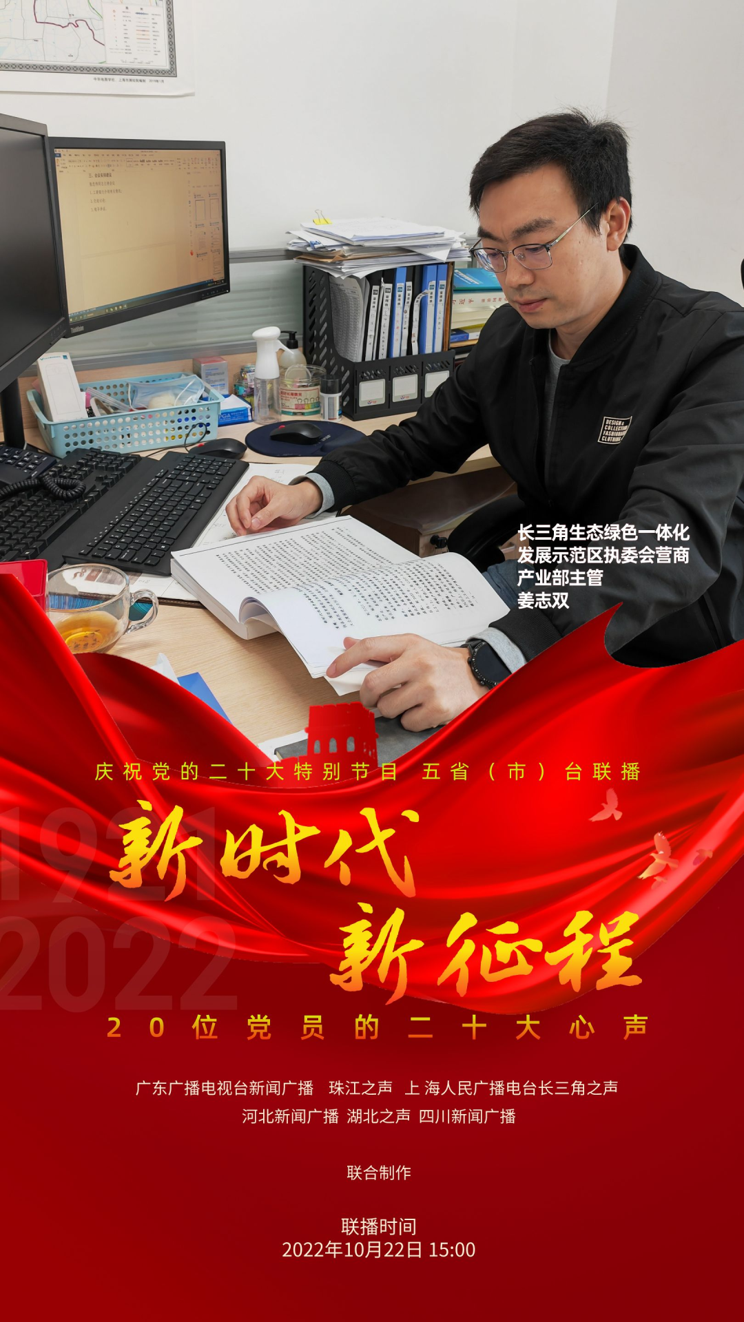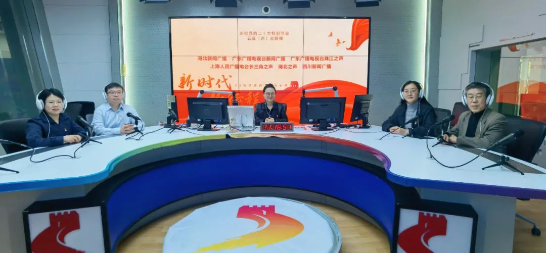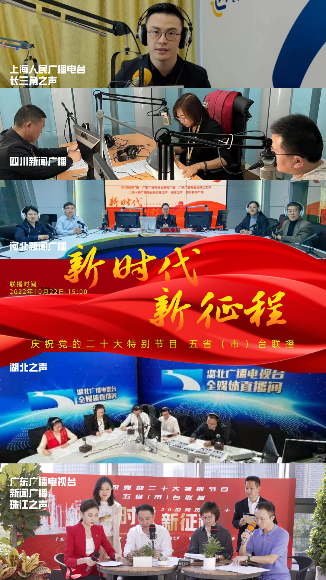 为庆祝党的二十大,反映各地党员群众对二十大的热烈反响,展现全党全国人民团结奋进、勇创辉煌的精神面貌,广东广播电视台新闻广播、珠江之声联合上海人民广播电台长三角之声、河北新闻广播、湖北之声、四川新闻广播10月22日15:00-17:00推出五省(市)台大联播特别节目《新时代 新征程--20位党员的二十大心声》。特别节目中,来自上海、河北、湖北、四川和广东的20位不同行业领域的党员讲述他们对党的二十大报告的深切领悟,分享他们踔厉奋发、锐意进取的奋斗故事,表达他们不忘初心、砥砺前行的心声。