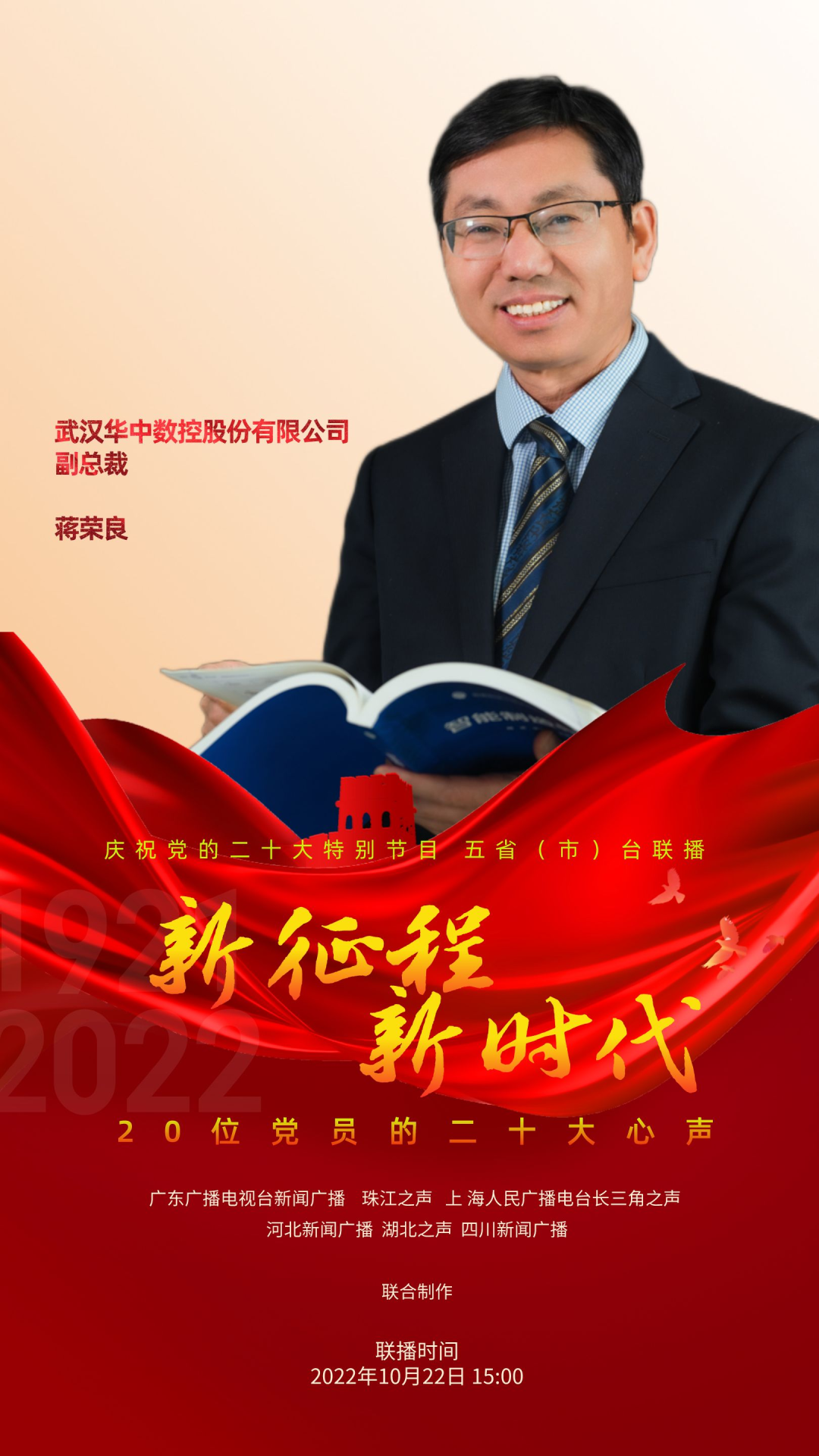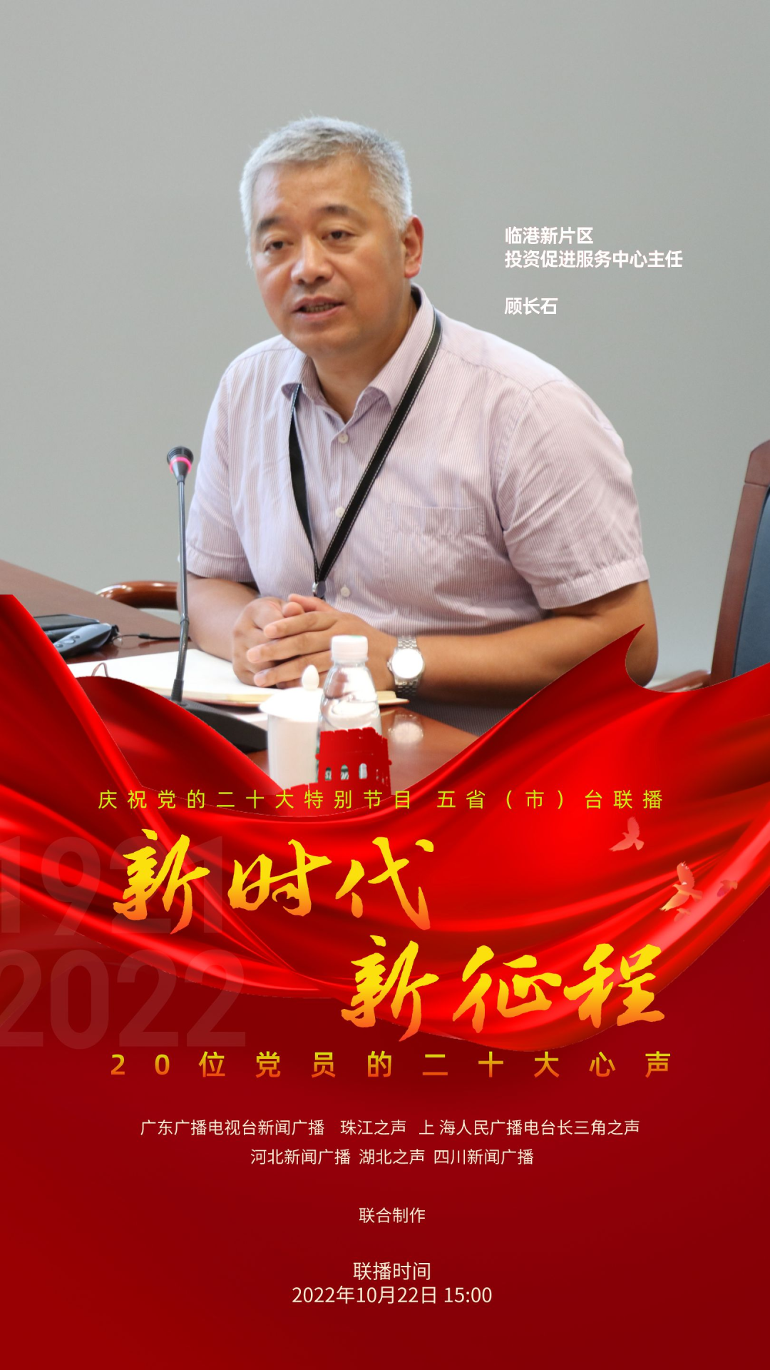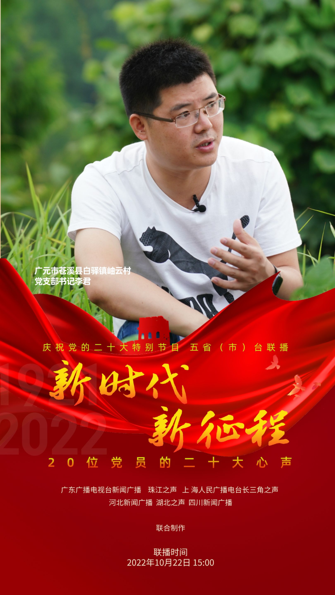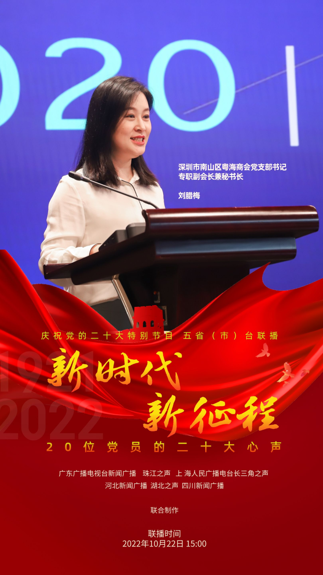 为庆祝党的二十大,反映各地党员群众对二十大的热烈反响,展现全党全国人民团结奋进、勇创辉煌的精神面貌,广东广播电视台新闻广播、珠江之声联合上海人民广播电台长三角之声、河北新闻广播、湖北之声、四川新闻广播10月22日15:00-17:00推出五省(市)台大联播特别节目《新时代 新征程--20位党员的二十大心声》。特别节目中,来自上海、河北、湖北、四川和广东的20位不同行业领域的党员讲述他们对党的二十大报告的深切领悟,分享他们踔厉奋发、锐意进取的奋斗故事,表达他们不忘初心、砥砺前行的心声。