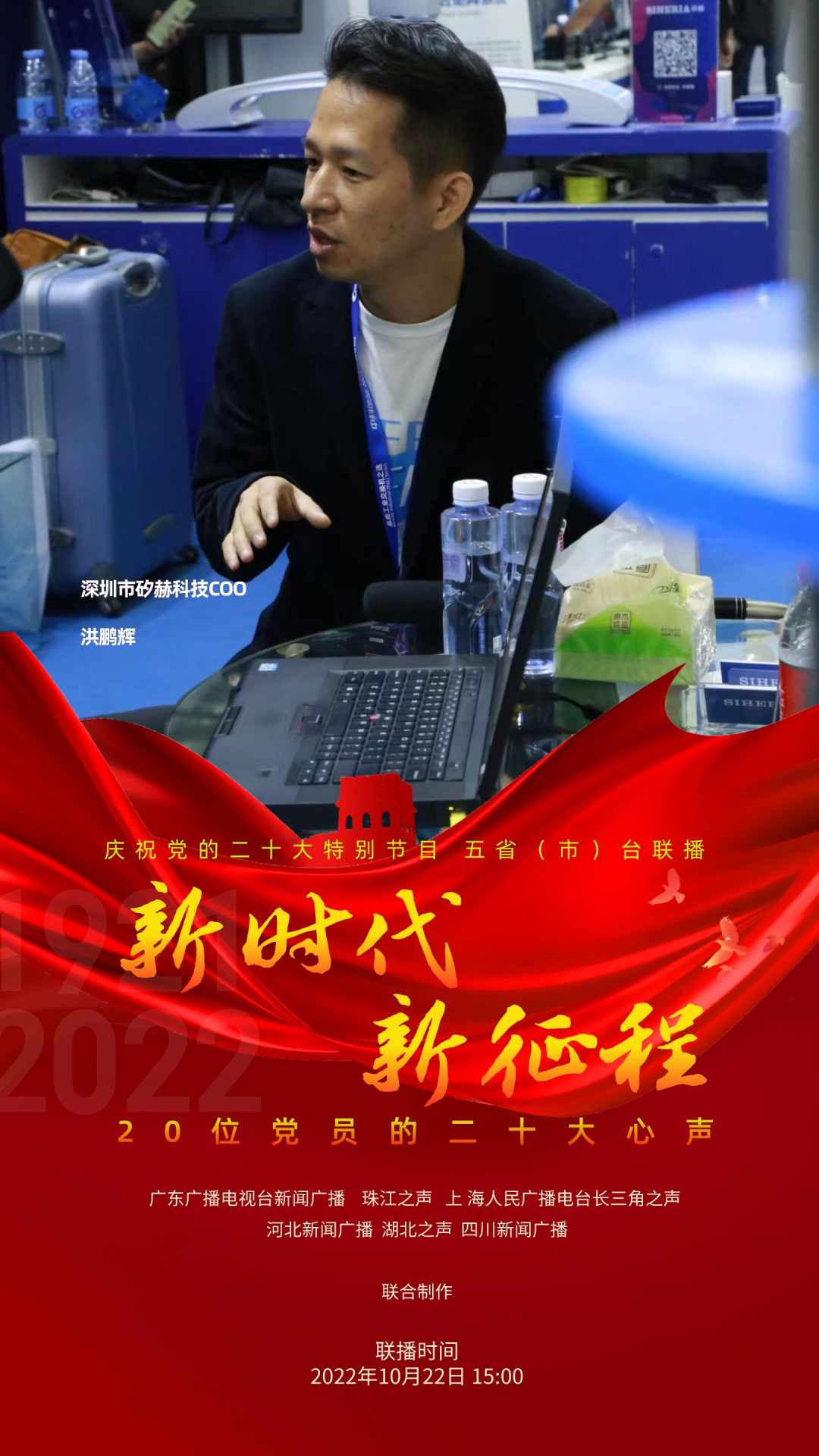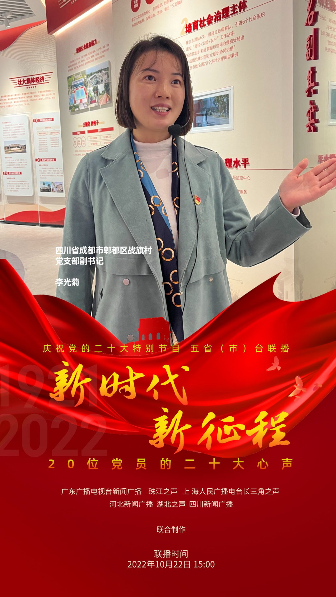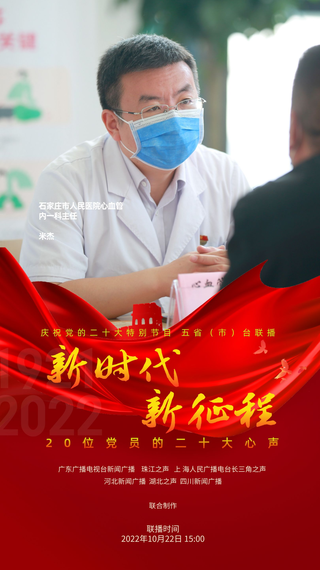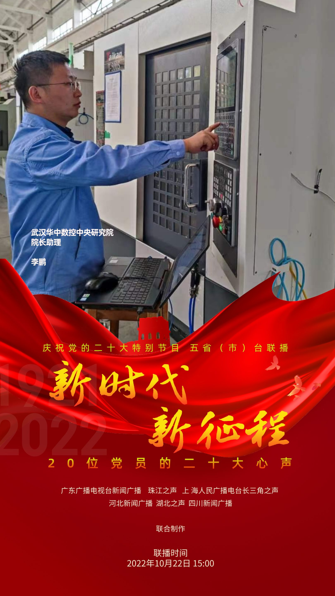 为庆祝党的二十大,反映各地党员群众对二十大的热烈反响,展现全党全国人民团结奋进、勇创辉煌的精神面貌,广东广播电视台新闻广播、珠江之声联合上海人民广播电台长三角之声、河北新闻广播、湖北之声、四川新闻广播10月22日15:00-17:00推出五省(市)台大联播特别节目《新时代 新征程--20位党员的二十大心声》。特别节目中,来自上海、河北、湖北、四川和广东的20位不同行业领域的党员讲述他们对党的二十大报告的深切领悟,分享他们踔厉奋发、锐意进取的奋斗故事,表达他们不忘初心、砥砺前行的心声。