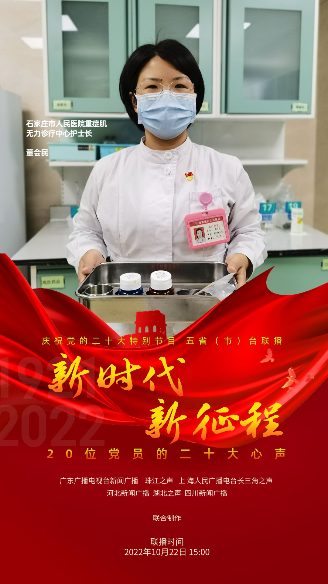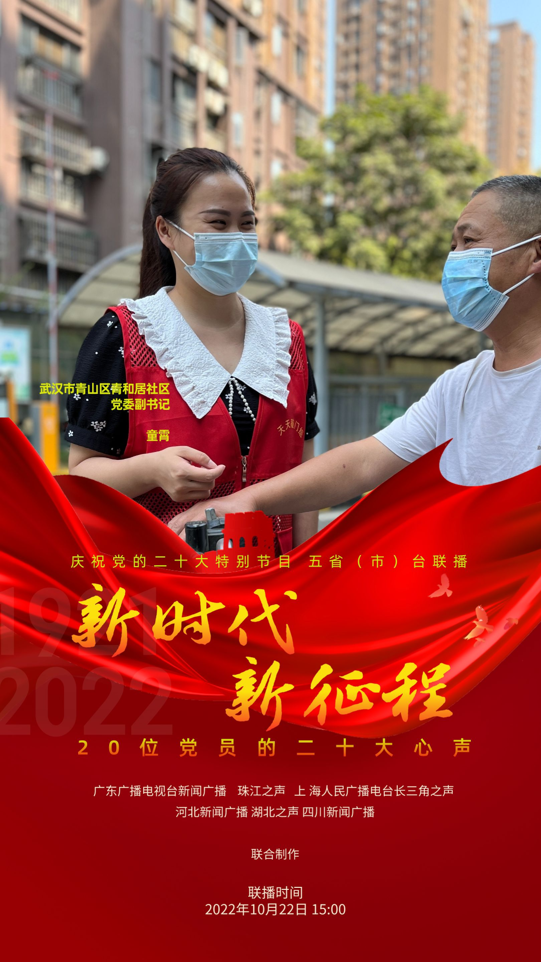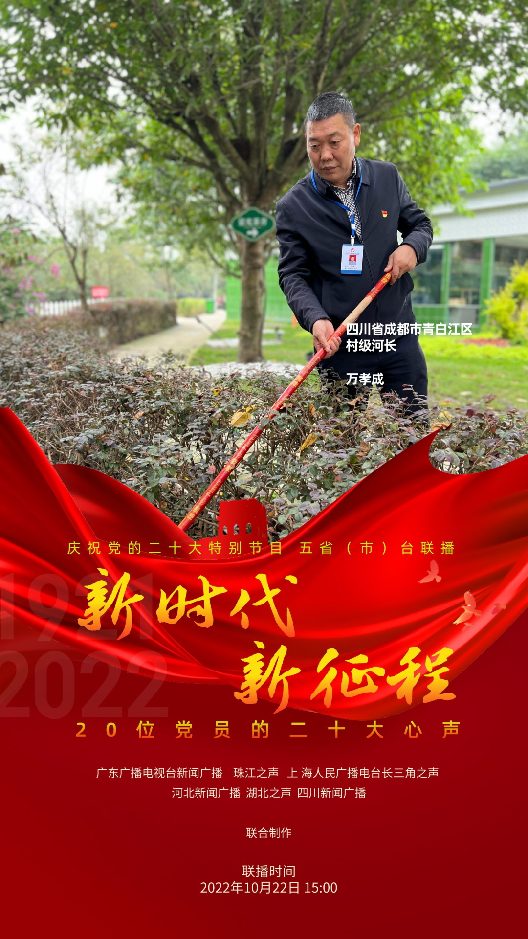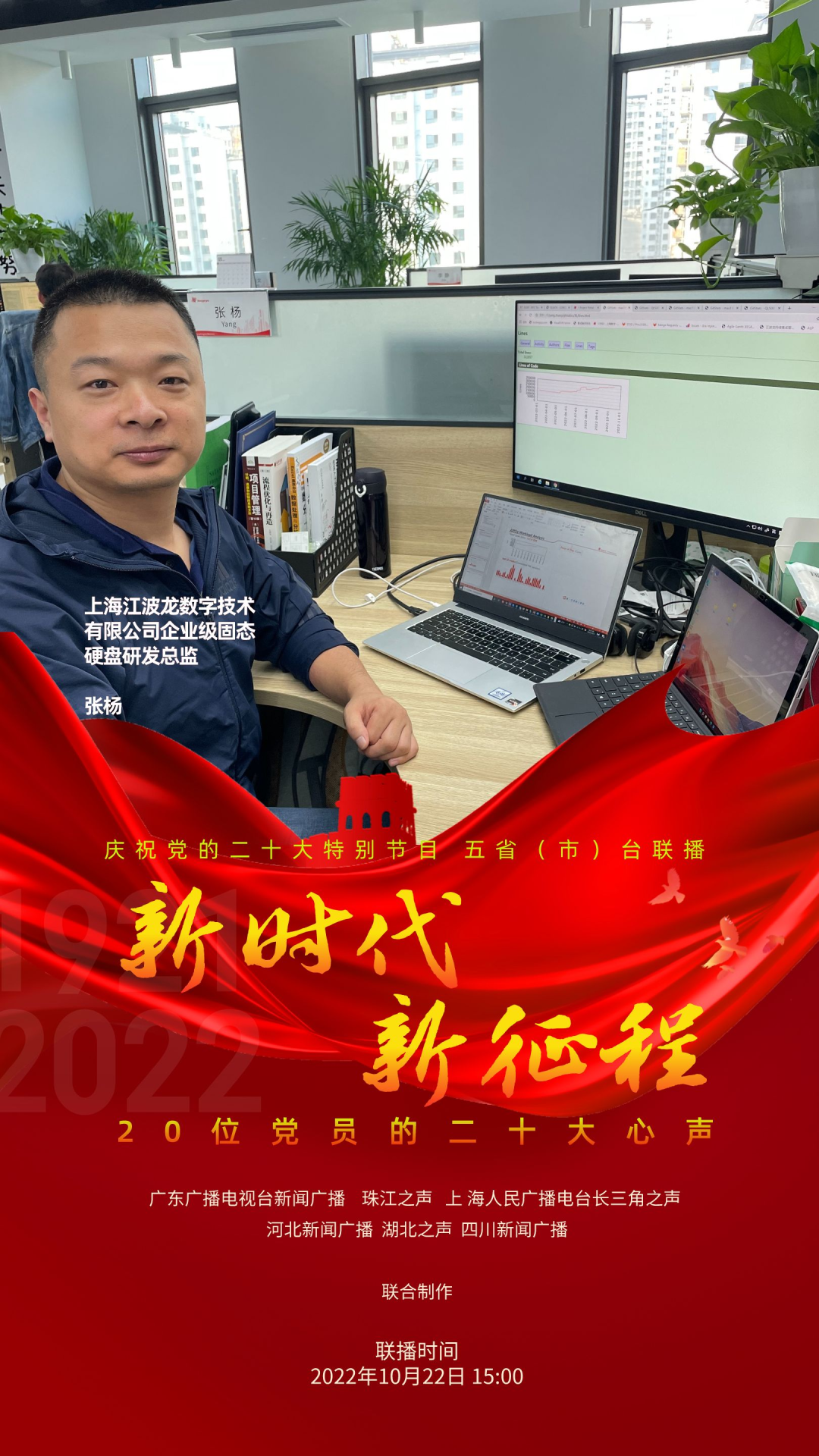 为庆祝党的二十大,反映各地党员群众对二十大的热烈反响,展现全党全国人民团结奋进、勇创辉煌的精神面貌,广东广播电视台新闻广播、珠江之声联合上海人民广播电台长三角之声、河北新闻广播、湖北之声、四川新闻广播10月22日15:00-17:00推出五省(市)台大联播特别节目《新时代 新征程--20位党员的二十大心声》。特别节目中,来自上海、河北、湖北、四川和广东的20位不同行业领域的党员讲述他们对党的二十大报告的深切领悟,分享他们踔厉奋发、锐意进取的奋斗故事,表达他们不忘初心、砥砺前行的心声。