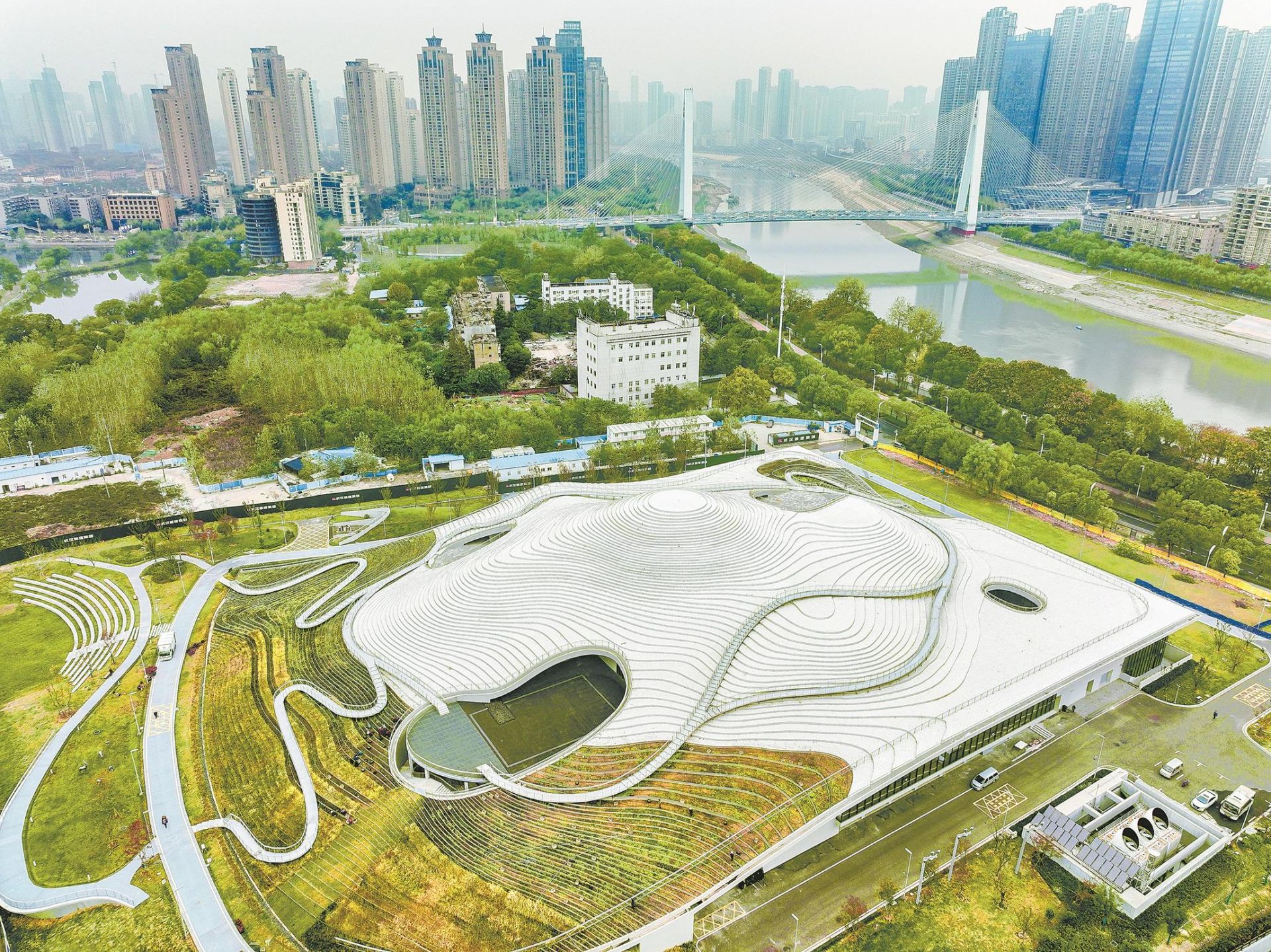 自2017年破土动工至2022年完工期间,武汉美术馆(琴台馆)吸引了许多“拍客”“飞客”争相打卡。勤劳的“拍客”“飞客”们驱动着无人机,在这里自发拍下许多恢弘的画面和视频——在汉水和月湖之滨的绿色湿地中,一座庞大的山体建筑拔地而起,俯瞰是一层层的梯田,天晴时,银白色的屋顶在阳光映照下闪闪发光;下雨时,雾气蒸腾,整座美术馆与周围的湿地融为一体,宛如仙境。